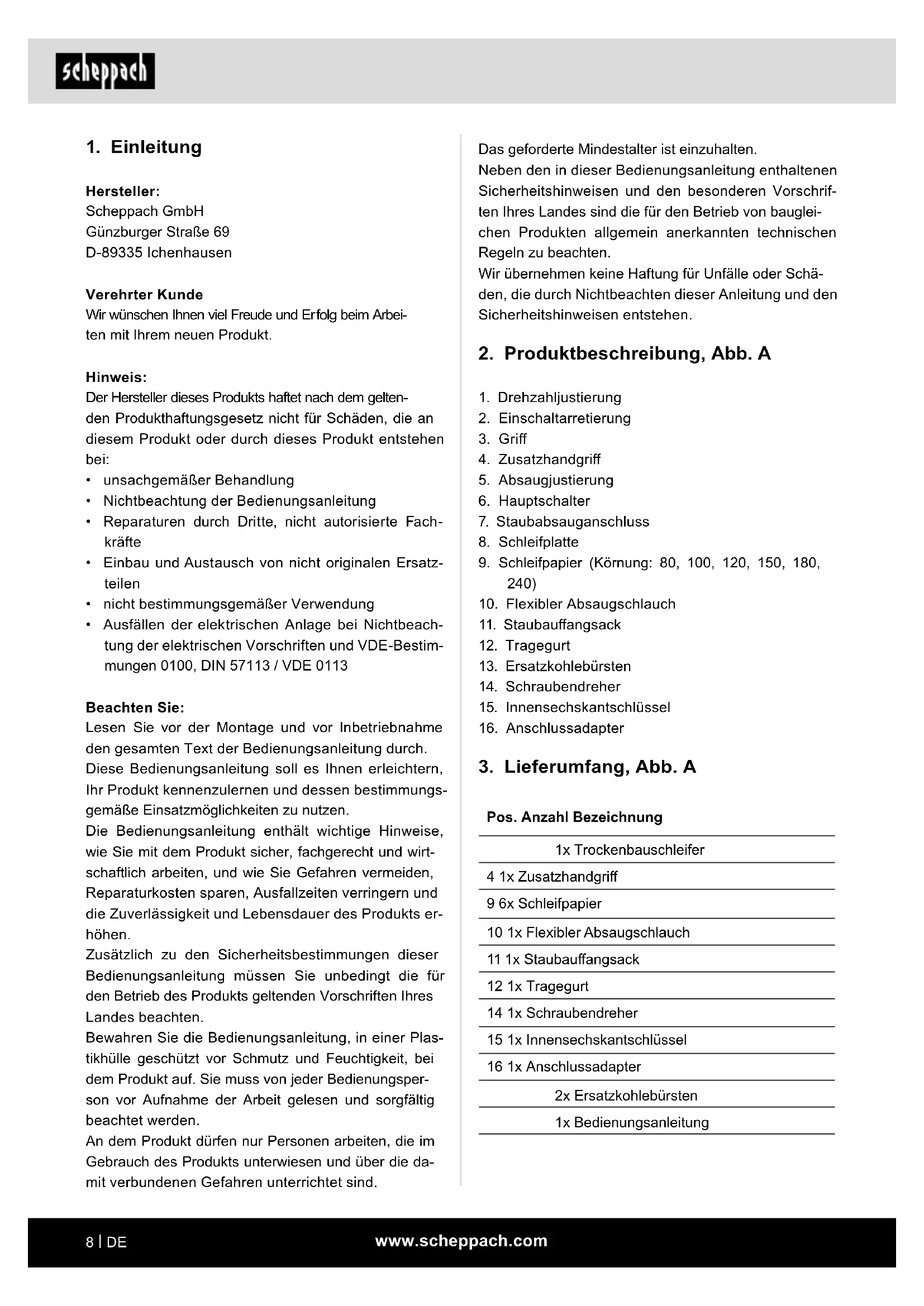 Der bestimmungsgemäße Gebrauch dieses Produkts umfasst das großächige Trockenschleifen von Tro- ckenbauwänden zur Vorbereitung vor dem Anstrich oder Tapezieren unter Verwendung geeigneter Schleif- blätter. Für die Bearbeitung von kleinen Flächen sowie Ecken und Kanten ist dieses Produkt nicht geeignet. Es eig- net sich zudem nicht zum Abschleifen von Tapeten und darf nicht zum Nassschleifen eingesetzt werden. Das Produkt darf nicht als Trenn- oder Schruppschlei- fer, Polier oder mit Drahtbürsten verwendet werden. Asbesthaltige Materialien dürfen mit diesem Produkt nicht bearbeitet werden. Das Produkt darf nur nach seiner Bestimmung ver- wendet werden. Jede weitere darüber hinausgehende Verwendung ist nicht bestimmungsgemäß. Für daraus hervorgerufene Schäden oder Verletzungen aller Art haftet der Benutzer/Bediener und nicht der Hersteller. Bestandteil der bestimmungsgemäßen Verwendung ist auch die Beachtung der Sicherheitshinweise, sowie die Montageanleitung und Betriebshinweise in der Be- triebsanleitung. Personen, die das Produkt verwenden und warten, müssen mit diesem vertraut und über mögliche Gefah- ren unterrichtet sein. Darüber hinaus sind die geltenden Unfallverhütungs- vorschriften genauestens einzuhalten. Sonstige allgemeine Regeln in arbeitsmedizinischen und sicherheitstechnischen Bereichen sind zu beach- ten. Veränderungen an dem Produkt schließen eine Haf- tung des Herstellers und daraus entstehende Schäden gänzlich aus. Das Produkt darf nur mit Originalteilen und Original- zubehör des Herstellers betrieben werden. Die Sicherheits-, Arbeits- und Wartungsvorschriften des Herstellers sowie die in den Technischen Daten angegebenen Abmessungen müssen eingehalten wer- den. Bitte beachten Sie, dass unsere Produkte bestim- mungsgemäß nicht für den gewerblichen, handwerkli- chen oder industriellen Einsatz konstruiert wurden. Wir übernehmen keine Gewährleistung, wenn das Produkt in Gewerbe-, Handwerks- oder Industriebetrieben so- wie bei gleichzusetzenden Tätigkeiten eingesetzt wird.www.scheppach.com