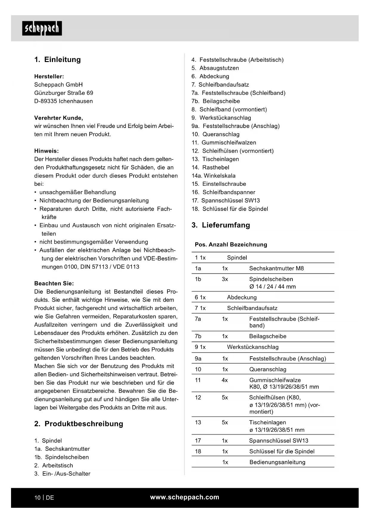 Pos. Anzahl Bezeichnung 1 1x Spindel 1a 1x Sechskantmutter M8 1b 3x Spindelscheiben Ø 14 / 24 / 44 mm 6 1x Abdeckung 7 1x Schleifbandaufsatz 7a 1x Feststellschraube (Schleif- band) 7b 1x Beilagscheibe 9 1x Werkstückanschlag 9a 1x Feststellschraube (Anschlag) 10 1x Queranschlag 11 4x Gummischleifwalze K80, Ø 13/19/26/38/51 mm 12 5x Schleifhülsen (K80, ø 13/19/26/38/51 mm) (vor- montiert) 13 5x Tischeinlagen ø 13/19/26/38/51 mm 17 1x Spannschlüssel SW13 18 1x Schlüssel für die Spindel 1x Bedienungsanleitungwww.scheppach.com