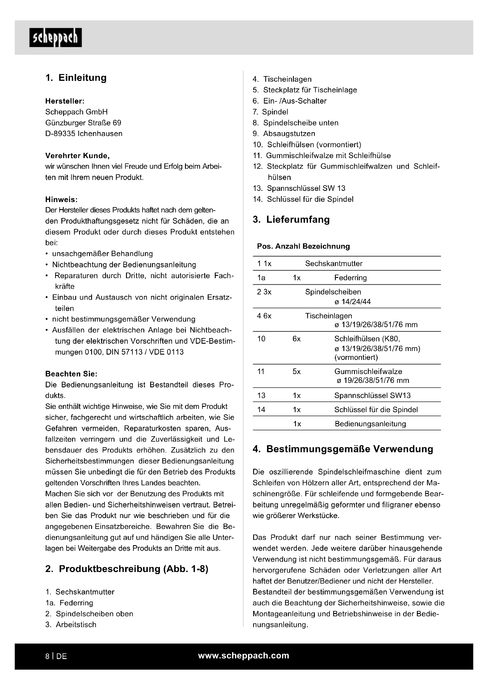 Die oszillierende Spindelschleifmaschine dient zum Schleifen von Hölzern aller Art, entsprechend der Ma- schinengröße. Für schleifende und formgebende Bear- beitung unregelmäßig geformter und ligraner ebenso wie größerer Werkstücke. Das Produkt darf nur nach seiner Bestimmung ver- wendet werden. Jede weitere darüber hinausgehende Verwendung ist nicht bestimmungsgemäß. Für daraus hervorgerufene Schäden oder Verletzungen aller Art haftet der Benutzer/Bediener und nicht der Hersteller. Bestandteil der bestimmungsgemäßen Verwendung ist auch die Beachtung der Sicherheitshinweise, sowie die Montageanleitung und Betriebshinweise in der Bedie- nungsanleitung.www.scheppach.com