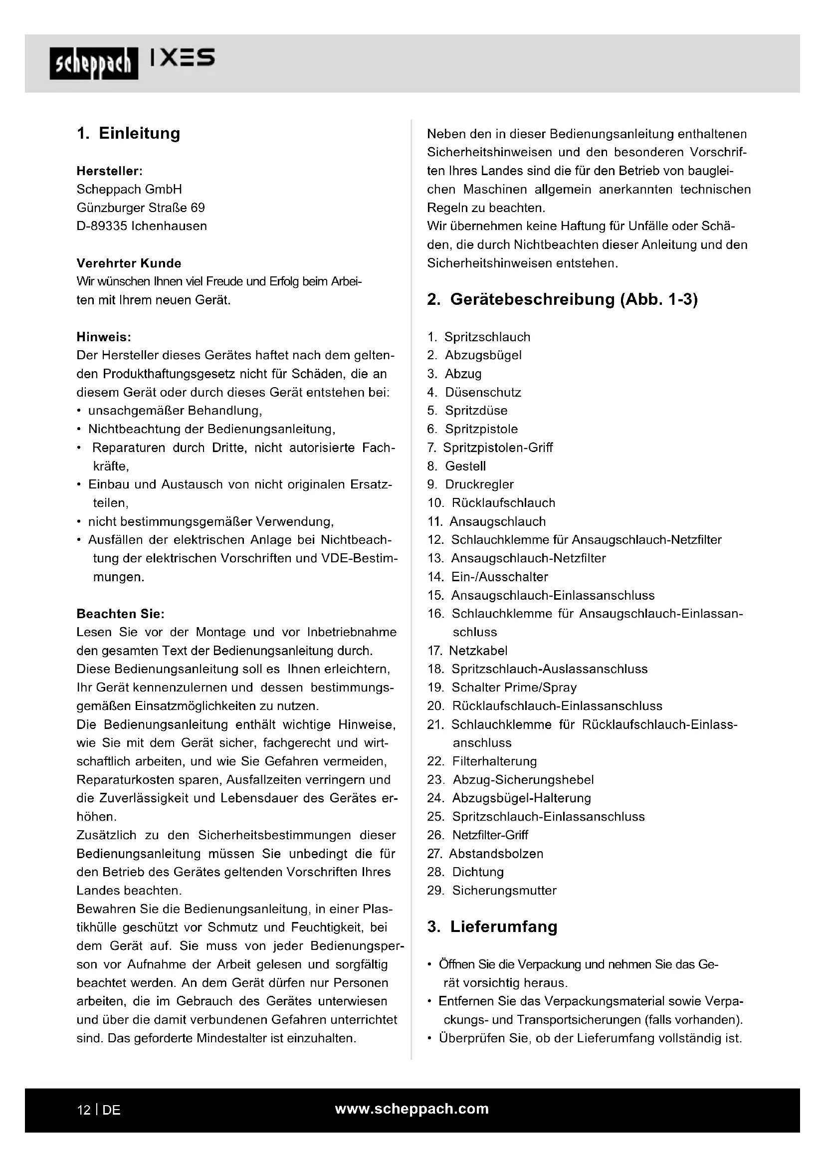 Das Airless Farbsprühsystem ist für mittlere bis große Renovierungsarbeiten in Haus und Garten geeignet. Es wurde so entwickelt, dass Farbe direkt aus dem Farb- eimer angesaugt und in kurzer Zeit auf große Flächen aufgetragen werden kann. Dazu gehören Oberächen wie Zäune, Pergolen, Schuppen, Holzfassaden, Pavil- lons, Garagentore, Gitter und Wände. Das Gerät ist nur für den Privatgebrauch bestimmt. Im Kapitel 8 nden Sie weitere Informationen dazu, welche Materialien mit dem Gerät verwendet werden können. Lesen Sie diese Bedienungsanleitung und machen Sie sich damit vertraut, bevor Sie das Gerät verwenden. Diese Bedienungsanleitung muss auch weitergegeben werden, wenn das Gerät von Dritten benutzt wird. Das Gerät darf nur nach seiner Bestimmung verwen- det werden. Jede weitere darüber hinausgehende Verwendung ist nicht bestimmungsgemäß. Für daraus hervorgerufene Schäden oder Verletzungen aller Art haftet der Benutzer und nicht der Hersteller. Veränderungen an der Maschine schließen eine Haf- tung des Herstellers und daraus entstehende Schäden gänzlich aus. Bitte beachten Sie, dass das Gerät bestimmungsge- mäß nicht für den gewerblichen, handwerklichen oder industriellen Einsatz konstruiert wurde.www.scheppach.com