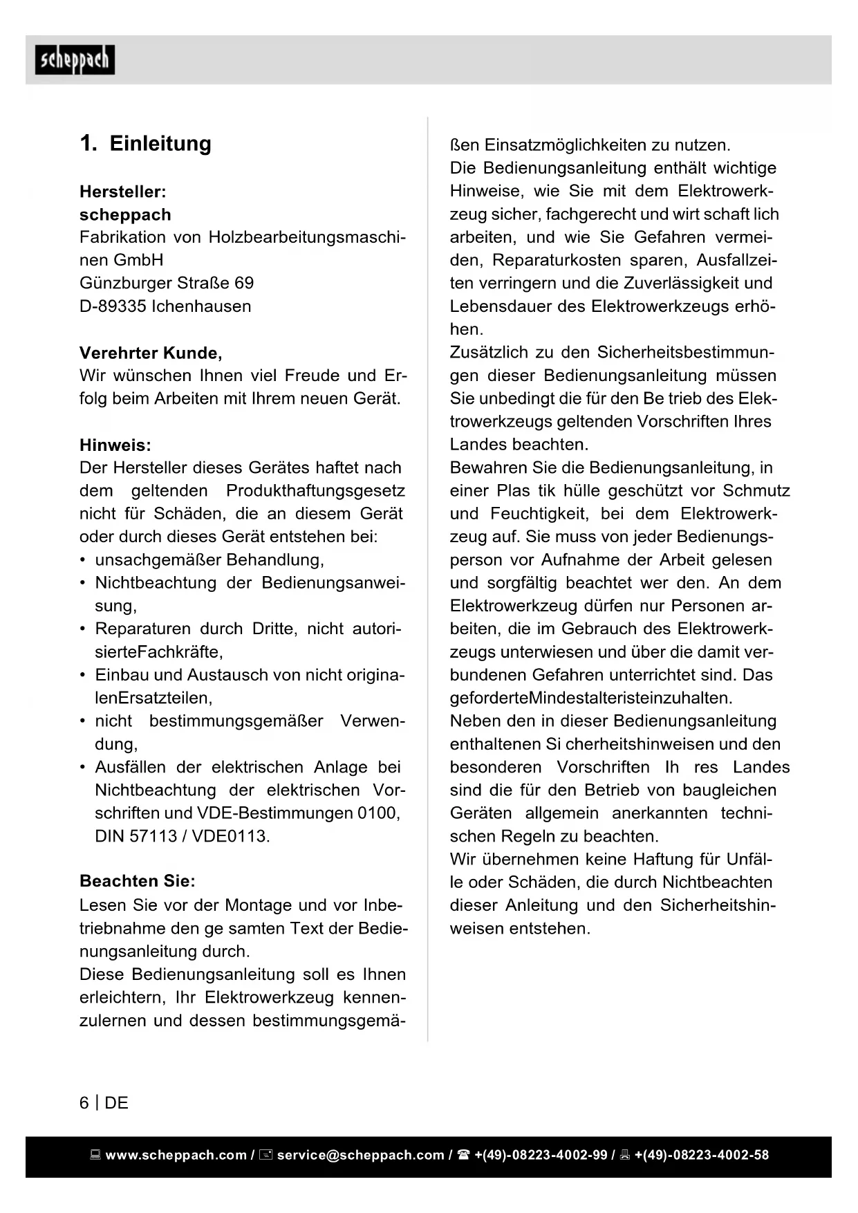 Hersteller: scheppach Fabrikation von Holzbearbeitungsmaschi- nen GmbH Günzburger Straße 69 D-89335 Ichenhausen Verehrter Kunde, Wir wünschen Ihnen viel Freude und Er- folg beim Arbeiten mit Ihrem neuen Gerät. Hinweis: Der Hersteller dieses Gerätes haftet nach dem geltenden Produkthaftungsgesetz nicht für Schäden, die an diesem Gerät oder durch dieses Gerät entstehen bei: