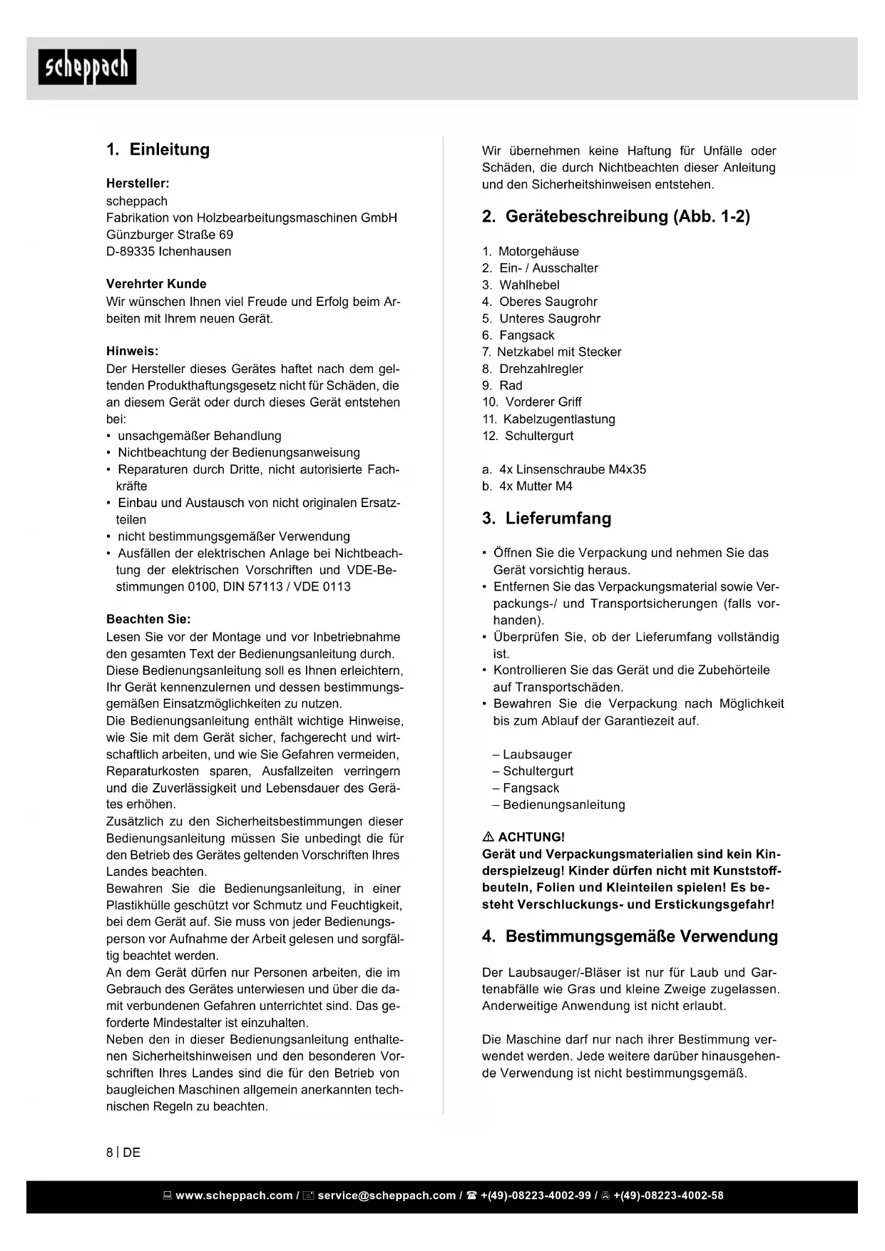 - Produktabhängig auch über 24 Monate; länderbezogen können erweiterte Garantieleistungen gelten ** Verbindungskosten: kostenlos aus dem deutschen Festnetz Änderungen dieser Garantiebedingungen ohne Voranmeldung behalten wir uns jederzeit vor. www.scheppach.com / service@scheppach.com / +(49)-08223-4002-99 / +(49)-08223-4002-58 Marke / Brand: SCHEPPACH Art.-Bezeichnung / Article name: LAUBSAUGER / BLÄSER - LB2600E