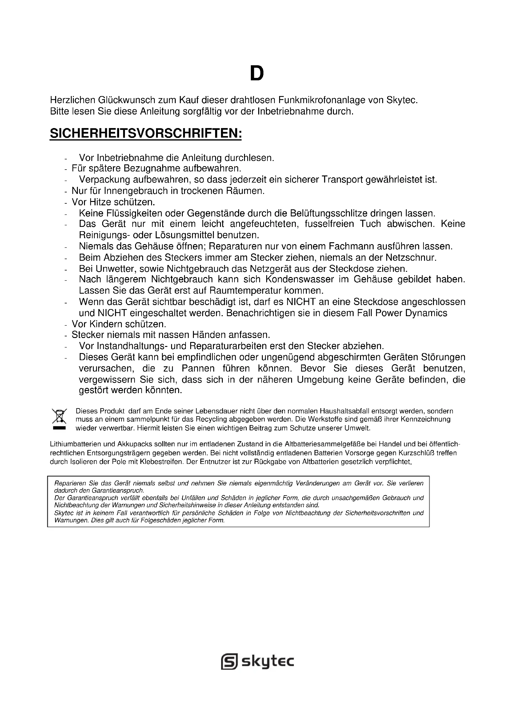 BE DK F FI DE HU IT NL NO PL PT RO SI ES SE CH GB België (BE), Denemarken (DK), Frankrijk (F), Finland (FI), Duitsland (DE), Hongarije (HU), Italië (IT), Nederland (NL), Noorwegen (NO), Polen (PL), Portugal (PT), Roemenië (RO), Slovenië (Sl), Spanje (ES), Zweden (SE), Zwitserland (CH), Verenigd Koninkrijk (GB) Neem contact op met uw radiolicentie autoriteit in uw land, die kan u adviseren over de beschikbare frequenties en zendvermogensvereisten.D Herzlichen Glückwunsch zum Kauf dieser drahtlosen Funkmikrofonanlage von Skytec. Bitte lesen Sie diese Anleitung sorgfältig vor der Inbetriebnahme durch. SICHERHEITSVORSCHRIFTEN: - Vor Inbetriebnahme die Anleitung durchlesen. - Für spätere Bezugnahme aufbewahren. - Verpackung aufbewahren, so dass jederzeit ein sicherer Transport gewährleistet ist. - Nur für Innengebrauch in trockenen Räumen. - Vor Hitze schützen. - Keine Flüssigkeiten oder Gegenstände durch die Belüftungsschlitze dringen lassen. - Das Gerät nur mit einem leicht angefeuchteten, fusselfreien Tuch abwischen. Keine Reinigungs- oder Lösungsmittel benutzen. - Niemals das Gehäuse öffnen; Reparaturen nur von einem Fachmann ausführen lassen. - Beim Abziehen des Steckers immer am Stecker ziehen, niemals an der Netzschnur. - Bei Unwetter, sowie Nichtgebrauch das Netzgerät aus der Steckdose ziehen. - Nach längerem Nichtgebrauch kann sich Kondenswasser im Gehäuse gebildet haben. Lassen Sie das Gerät erst auf Raumtemperatur kommen. - Wenn das Gerät sichtbar beschädigt ist, darf es NICHT an eine Steckdose angeschlossen und NICHT eingeschaltet werden. Benachrichtigen sie in diesem Fall Power Dynamics - Vor Kindern schützen. - Stecker niemals mit nassen Händen anfassen. - Vor Instandhaltungs- und Reparaturarbeiten erst den Stecker abziehen. - Dieses Gerät kann bei empfindlichen oder ungenügend abgeschirmten Geräten Störungen verursachen, die zu Pannen führen können. Bevor Sie dieses Gerät benutzen, vergewissern Sie sich, dass sich in der näheren Umgebung keine Geräte befinden, die gestört werden könnten. Dieses Produkt darf am Ende seiner Lebensdauer nicht über den normalen Haushaltsabfall entsorgt werden, sondern muss an einem sammelpunkt für das Recycling abgegeben werden. Die Werkstoffe sind gemäß ihrer Kennzeichnung wieder verwertbar. Hiermit leisten Sie einen wichtigen Beitrag zum Schutze unserer Umwelt. Lithiumbatterien und Akkupacks sollten nur im entladenen Zustand in die Altbatteriesammelgefäße bei Handel und bei öffentlich- rechtlichen Entsorgungsträgern gegeben werden. Bei nicht vollständig entladenen Batterien Vorsorge gegen Kurzschlüß treffen durch Isolieren der Pole mit Klebestreifen. Der Entnutzer ist zur Rückgabe von Altbatterien gesetzlich verpflichtet