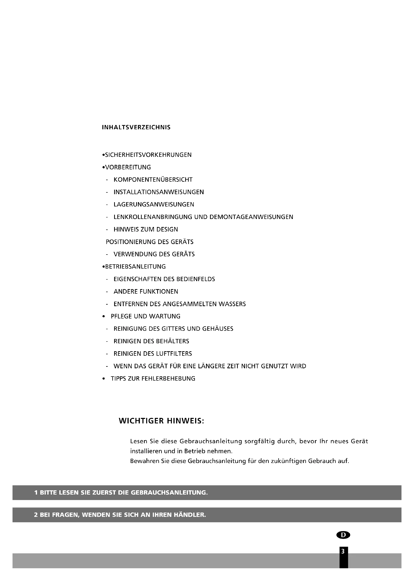 - TIPPS ZUR FEHLERBEHEBUNG WICHTIGER HINWEIS: Lesen Sie diese Gebrauchsanleitung sorgfältig durch, bevor Ihr neues Gerät installieren und in Betrieb nehmen. Bewahren Sie diese Gebrauchsanleitung für den zukünftigen Gebrauch auf.4 SICHERHEITSANWEISUNGEN Lesen Sie die Sicherheitsvorkehrungen vor dem Betrieb und der Installation. Um den Tod oder eine Verletzung des Bedieners und anderer Personen sowie Sachschäden zu verhindern, müssen folgende Anweisungen befolgt werden. Ein unsachgemäßer Betrieb aufgrund der Nichtbefolgung der Anweisungen kann zum Tode, zu Verletzungen oder zu Schäden führen. WARNUNG