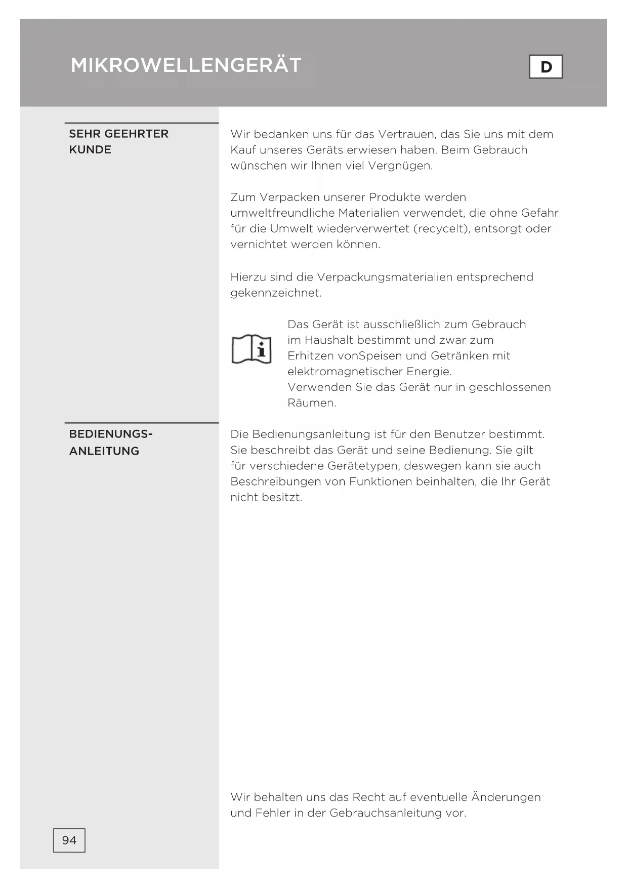 GARANTIE EN SERVICEWir bedanken uns für das Vertrauen, das Sie uns mit dem Kauf unseres Geräts erwiesen haben. Beim Gebrauch wünschen wir Ihnen viel Vergnügen. Zum Verpacken unserer Produkte werden umweltfreundliche Materialien verwendet, die ohne Gefahr für die Umwelt wiederverwertet (recycelt), entsorgt oder vernichtet werden können. Hierzu sind die Verpackungsmaterialien entsprechend gekennzeichnet. Das Gerät ist ausschließlich zum Gebrauch im Haushalt bestimmt und zwar zum Erhitzen vonSpeisen und Getränken mit elektromagnetischer Energie. Verwenden Sie das Gerät nur in geschlossenen Räumen. Die Bedienungsanleitung ist für den Benutzer bestimmt. Sie beschreibt das Gerät und seine Bedienung. Sie gilt für verschiedene Gerätetypen, deswegen kann sie auch Beschreibungen von Funktionen beinhalten, die Ihr Gerät nicht besitzt. SEHR GEEHRTER KUNDE