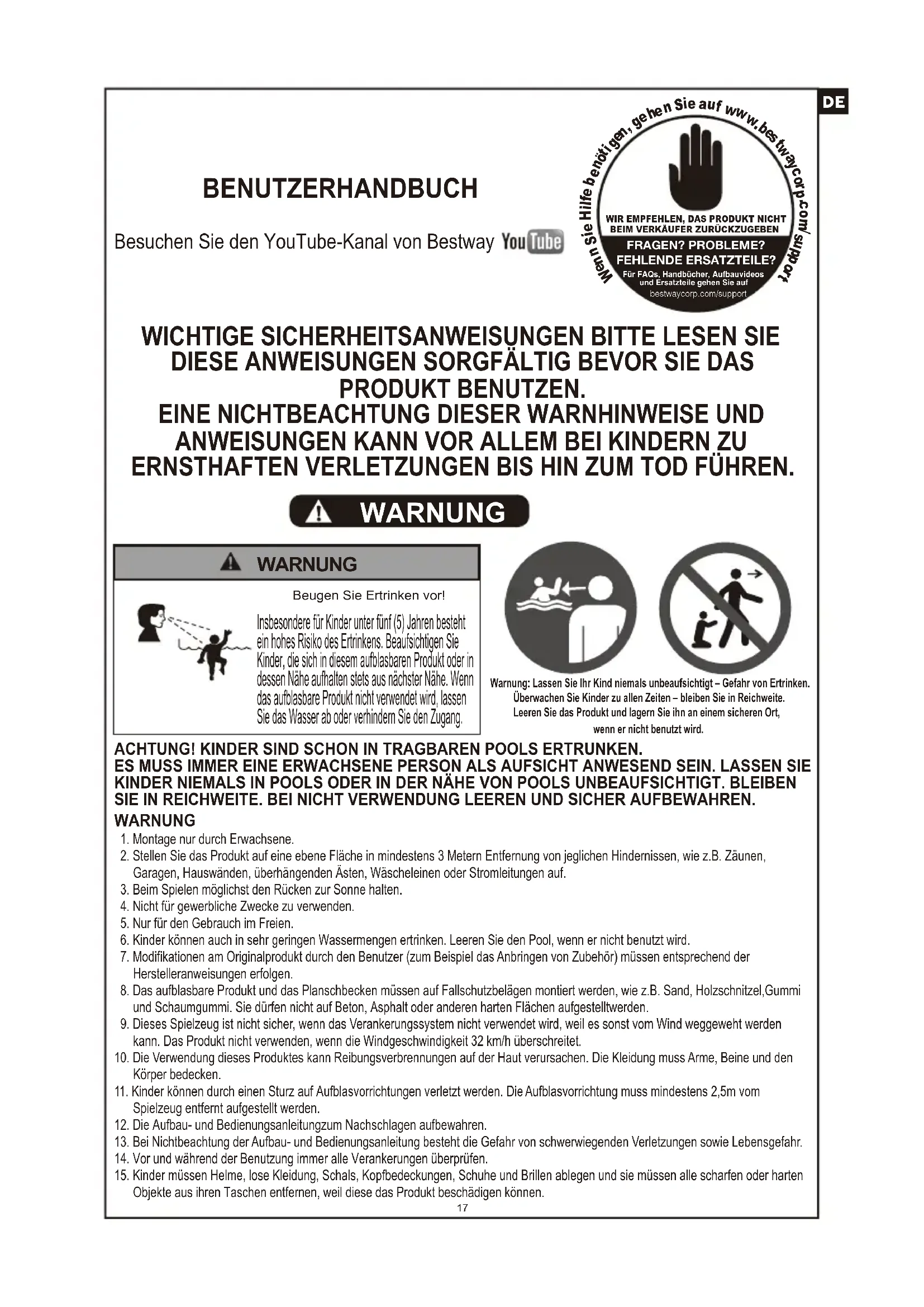 WIR EMPFEHLEN, DAS PRODUKT NICHTBEIM VERKÄUFER ZURÜCKZUGEBENFRAGEN? PROBLEME?FEHLENDE ERSATZTEILE?Für FAQs, Handbücher, Aufbauvideos und Ersatzteile gehen Sie auf bestwaycorp.com/supportBesuchen Sie den YouTube-Kanal von Bestway