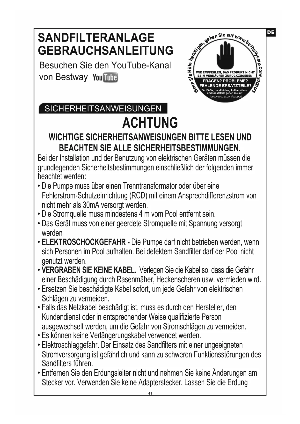 SANDFILTERANLAGE GEBRAUCHSANLEITUNG SICHERHEITSANWEISUNGEN Besuchen Sie den YouTube-Kanal von Bestway