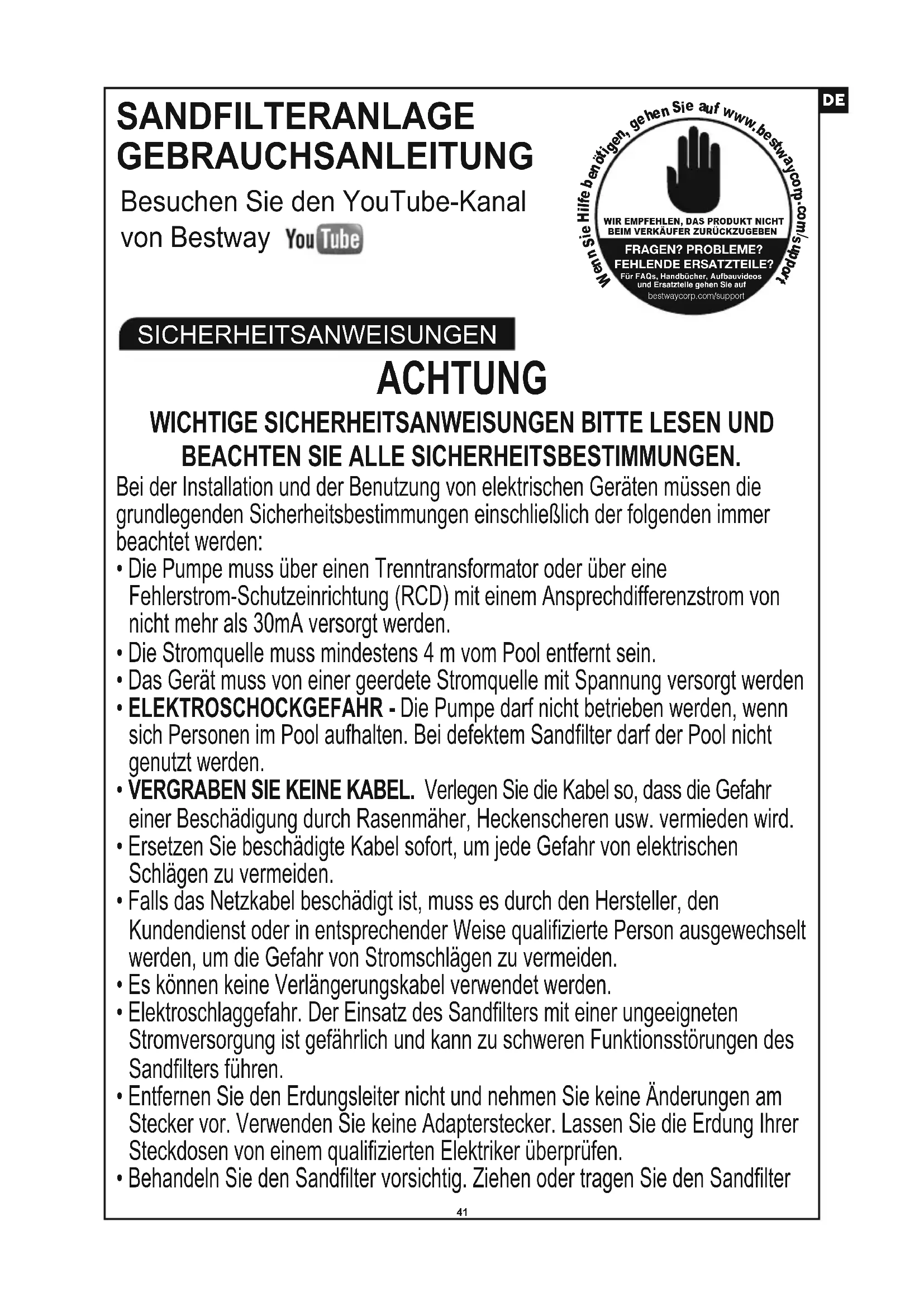 SANDFILTERANLAGE GEBRAUCHSANLEITUNG SICHERHEITSANWEISUNGEN Besuchen Sie den YouTube-Kanal von Bestway