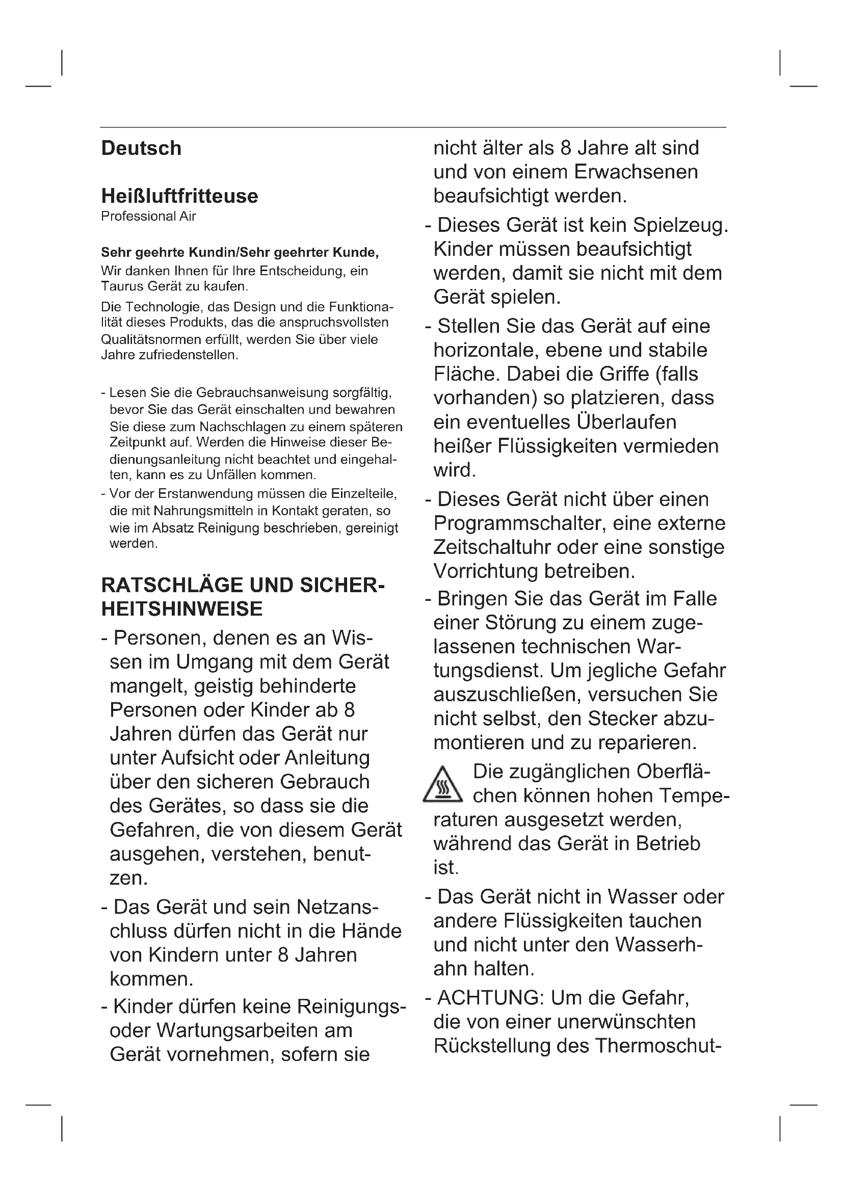 - NOTE: Pour frire dans la friteuse sans huile il est préférable d’utiliser des ingrédients prévus pour le four.Deutsch Heißluftfritteuse Professional Air Sehr geehrte Kundin/Sehr geehrter Kunde, Wir danken Ihnen für Ihre Entscheidung, ein Taurus Gerät zu kaufen. Die Technologie, das Design und die Funktiona- lität dieses Produkts, das die anspruchsvollsten Qualitätsnormen erfüllt, werden Sie über viele Jahre zufriedenstellen. - Lesen Sie die Gebrauchsanweisung sorgfältig, bevor Sie das Gerät einschalten und bewahren Sie diese zum Nachschlagen zu einem späteren Zeitpunkt auf. Werden die Hinweise dieser Be- dienungsanleitung nicht beachtet und eingehal- ten, kann es zu Unfällen kommen. - Vor der Erstanwendung müssen die Einzelteile, die mit Nahrungsmitteln in Kontakt geraten, so wie im Absatz Reinigung beschrieben, gereinigt werden.