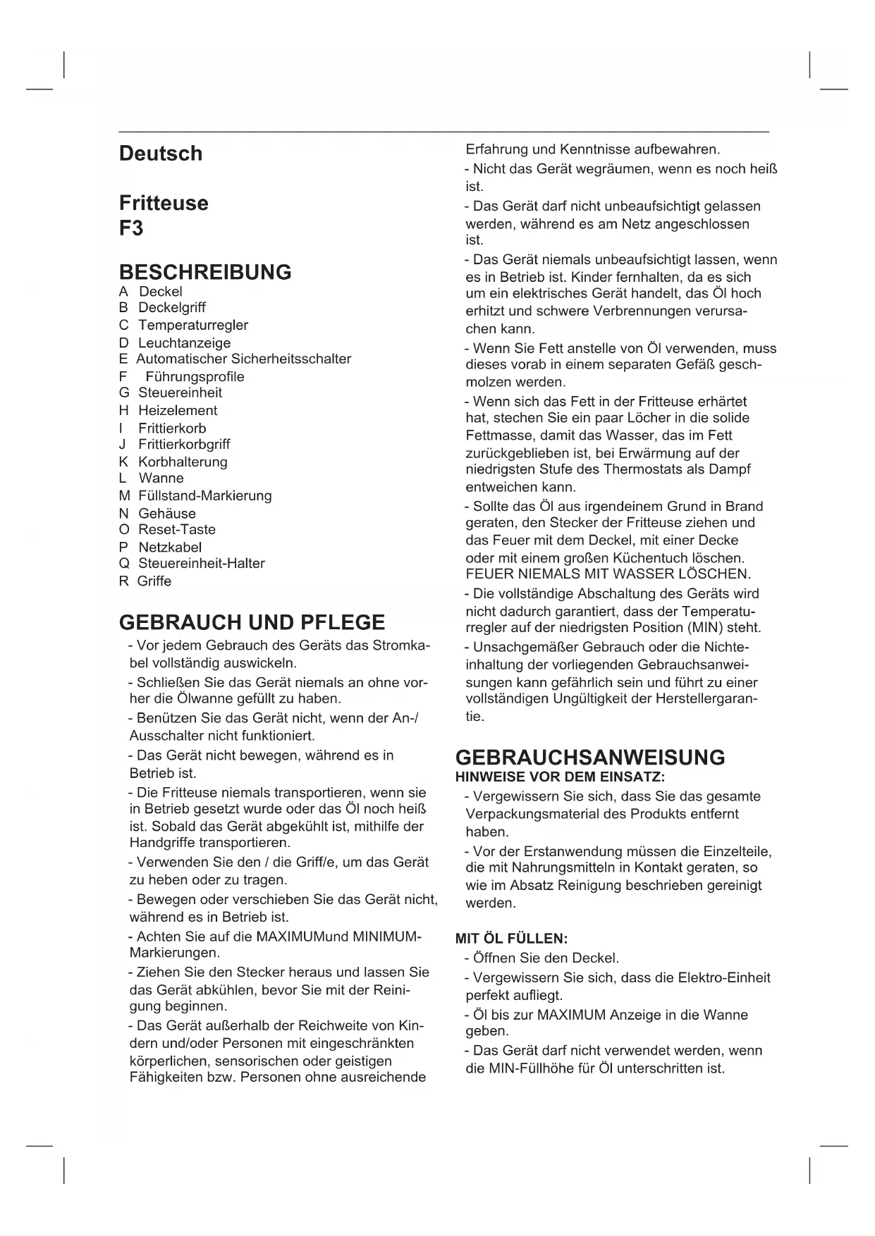 BESCHREIBUNG A Deckel B Deckelgriff C Temperaturregler D Leuchtanzeige E Automatischer Sicherheitsschalter F Führungsprole G Steuereinheit H Heizelement I Frittierkorb J Frittierkorbgriff K Korbhalterung L Wanne M Füllstand-Markierung N Gehäuse O Reset-Taste P Netzkabel Q Steuereinheit-Halter R Griffe