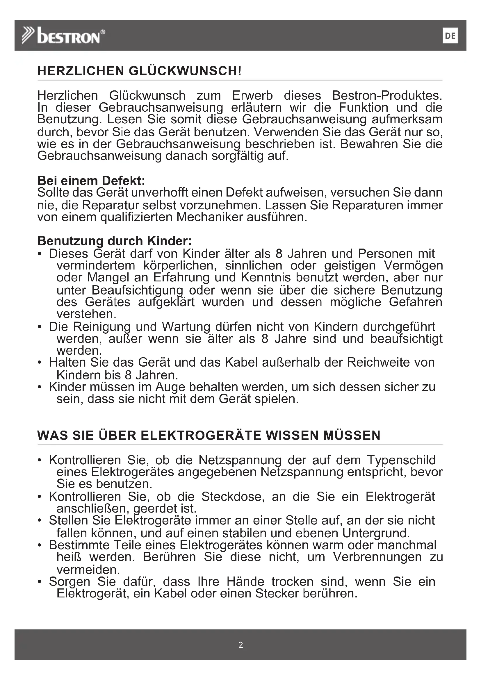 VoltsHERZLICHEN GLÜCKWUNSCH! Herzlichen Glückwunsch zum Erwerb dieses Bestron-Produktes. In dieser Gebrauchsanweisung erläutern wir die Funktion und die Benutzung. Lesen Sie somit diese Gebrauchsanweisung aufmerksam durch, bevor Sie das Gerät benutzen. Verwenden Sie das Gerät nur so, wie es in der Gebrauchsanweisung beschrieben ist. Bewahren Sie die Gebrauchsanweisung danach sorgfältig auf. Bei einem Defekt: Sollte das Gerät unverhofft einen Defekt aufweisen, versuchen Sie dann nie, die Reparatur selbst vorzunehmen. Lassen Sie Reparaturen immer von einem qualifizierten Mechaniker ausführen. Benutzung durch Kinder: