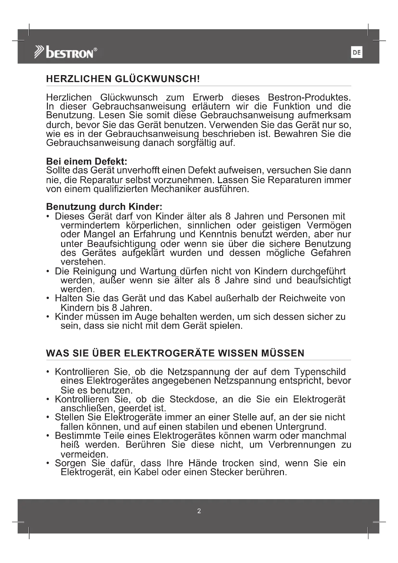 VoltsHERZLICHEN GLÜCKWUNSCH! Herzlichen Glückwunsch zum Erwerb dieses Bestron-Produktes. In dieser Gebrauchsanweisung erläutern wir die Funktion und die Benutzung. Lesen Sie somit diese Gebrauchsanweisung aufmerksam durch, bevor Sie das Gerät benutzen. Verwenden Sie das Gerät nur so, wie es in der Gebrauchsanweisung beschrieben ist. Bewahren Sie die Gebrauchsanweisung danach sorgfältig auf. Bei einem Defekt: Sollte das Gerät unverhofft einen Defekt aufweisen, versuchen Sie dann nie, die Reparatur selbst vorzunehmen. Lassen Sie Reparaturen immer von einem qualifizierten Mechaniker ausführen. Benutzung durch Kinder: