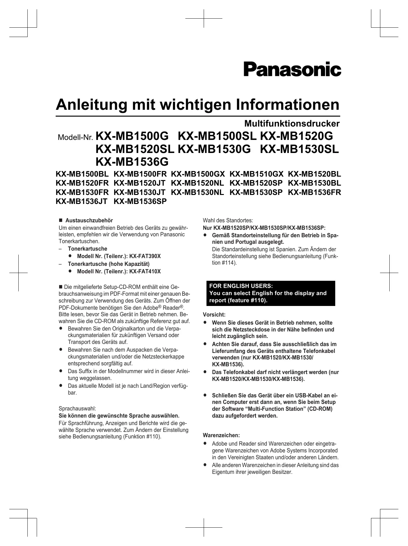 Model-Nr. KX-MB1500G KX-MB1500SL KX-MB1520G KX-MB1520SL KX-MB1530G KX-MB1530SL KX-MB1536G