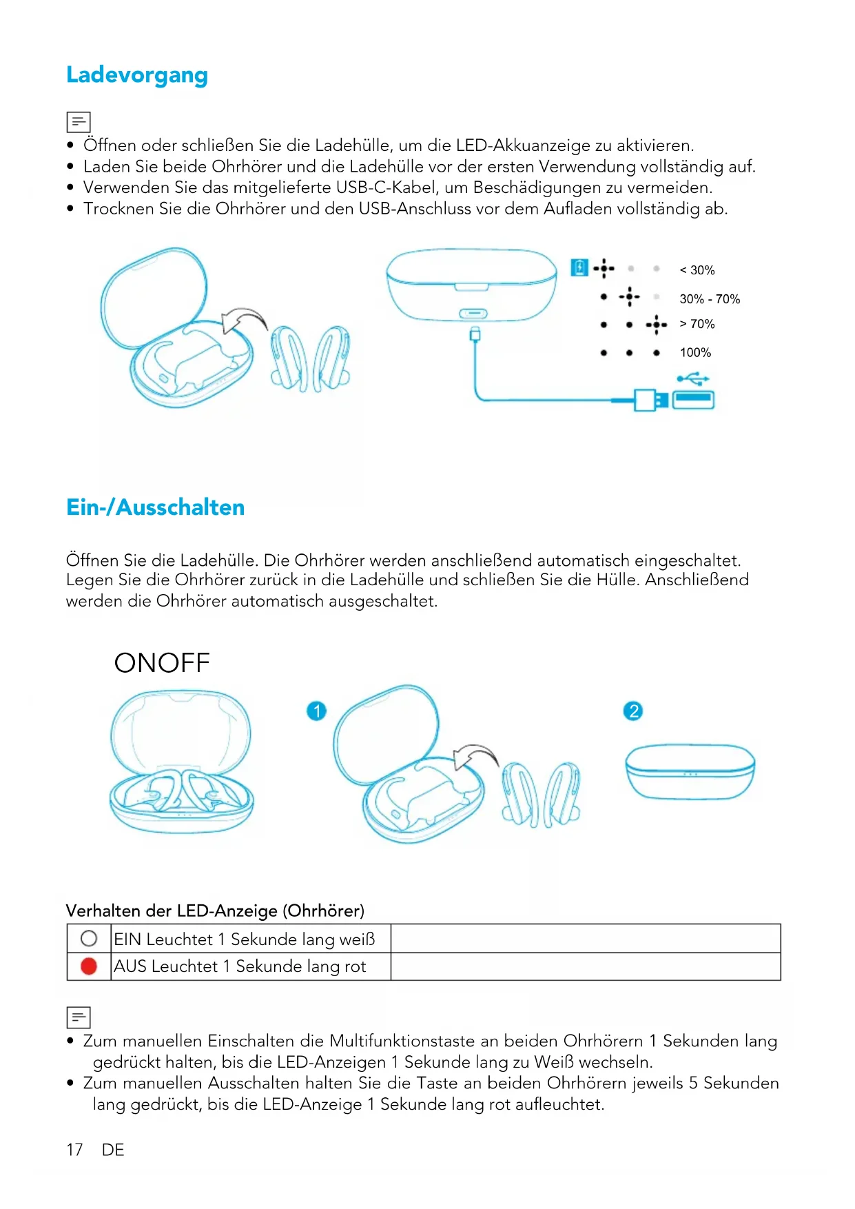 - Trocknen Sie die Ohrhörer und den USB-Anschluss vor dem Auaden vollständig ab. < 30% 30% - 70% > 70% 100% Ein-/Ausschalten Öffnen Sie die Ladehülle. Die Ohrhörer werden anschließend automatisch eingeschaltet. Legen Sie die Ohrhörer zurück in die Ladehülle und schließen Sie die Hülle. Anschließend werden die Ohrhörer automatisch ausgeschaltet. ON OFF
