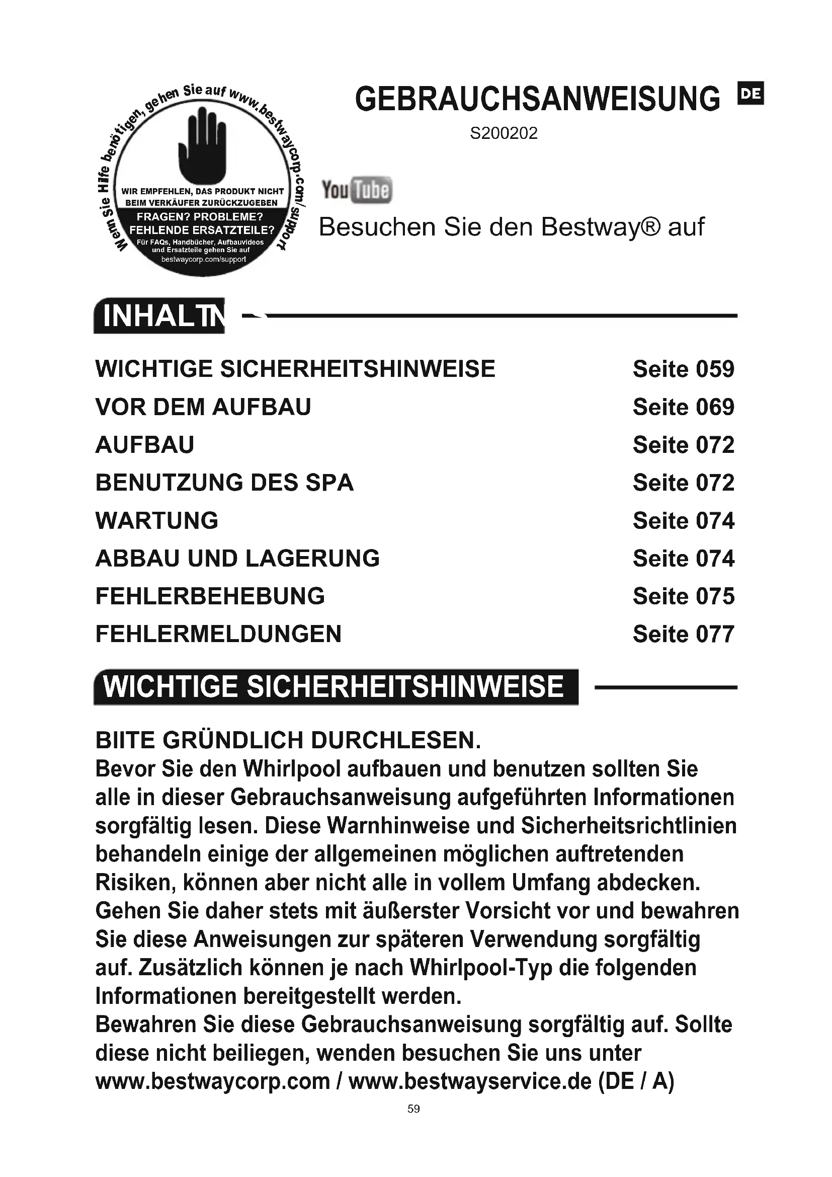 www.bestwaycorp.com. Detectado eléctrico del cable de tierra.BIITE GRÜNDLICH DURCHLESEN. Bevor Sie den Whirlpool aufbauen und benutzen sollten Sie alle in dieser Gebrauchsanweisung aufgeführten Informationen sorgfältig lesen. Diese Warnhinweise und Sicherheitsrichtlinien behandeln einige der allgemeinen möglichen auftretenden Risiken, können aber nicht alle in vollem Umfang abdecken. Gehen Sie daher stets mit äußerster Vorsicht vor und bewahren Sie diese Anweisungen zur späteren Verwendung sorgfältig auf. Zusätzlich können je nach Whirlpool-Typ die folgenden Informationen bereitgestellt werden. Bewahren Sie diese Gebrauchsanweisung sorgfältig auf. Sollte diese nicht beiliegen, wenden besuchen Sie uns unter www.bestwaycorp.com / www.bestwayservice.de (DE / A) WICHTIGE SICHERHEITSHINWEISE