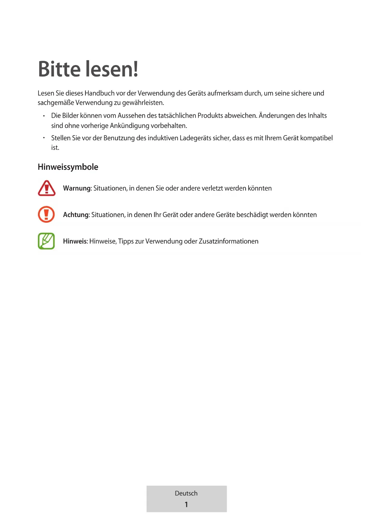Stellen Sie vor der Benutzung des induktiven Ladegeräts sicher, dass es mit Ihrem Gerät kompatibel ist. Hinweissymbole Warnung: Situationen, in denen Sie oder andere verletzt werden könnten Achtung: Situationen, in denen Ihr Gerät oder andere Geräte beschädigt werden könnten Hinweis: Hinweise, Tipps zur Verwendung oder Zusatzinformationen2 Deutsch Erste Schritte Lieferumfang Vergewissern Sie sich, dass der Produktkarton die folgenden Artikel enthält: