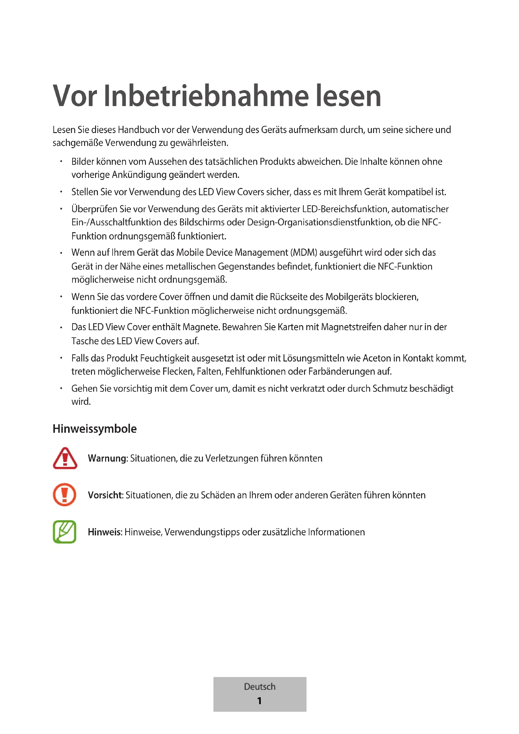 Gehen Sie vorsichtig mit dem Cover um, damit es nicht verkratzt oder durch Schmutz beschädigt wird. Hinweissymbole Warnung: Situationen, die zu Verletzungen führen könnten Vorsicht: Situationen, die zu Schäden an Ihrem oder anderen Geräten führen könnten Hinweis: Hinweise, Verwendungstipps oder zusätzliche Informationen Deutsch