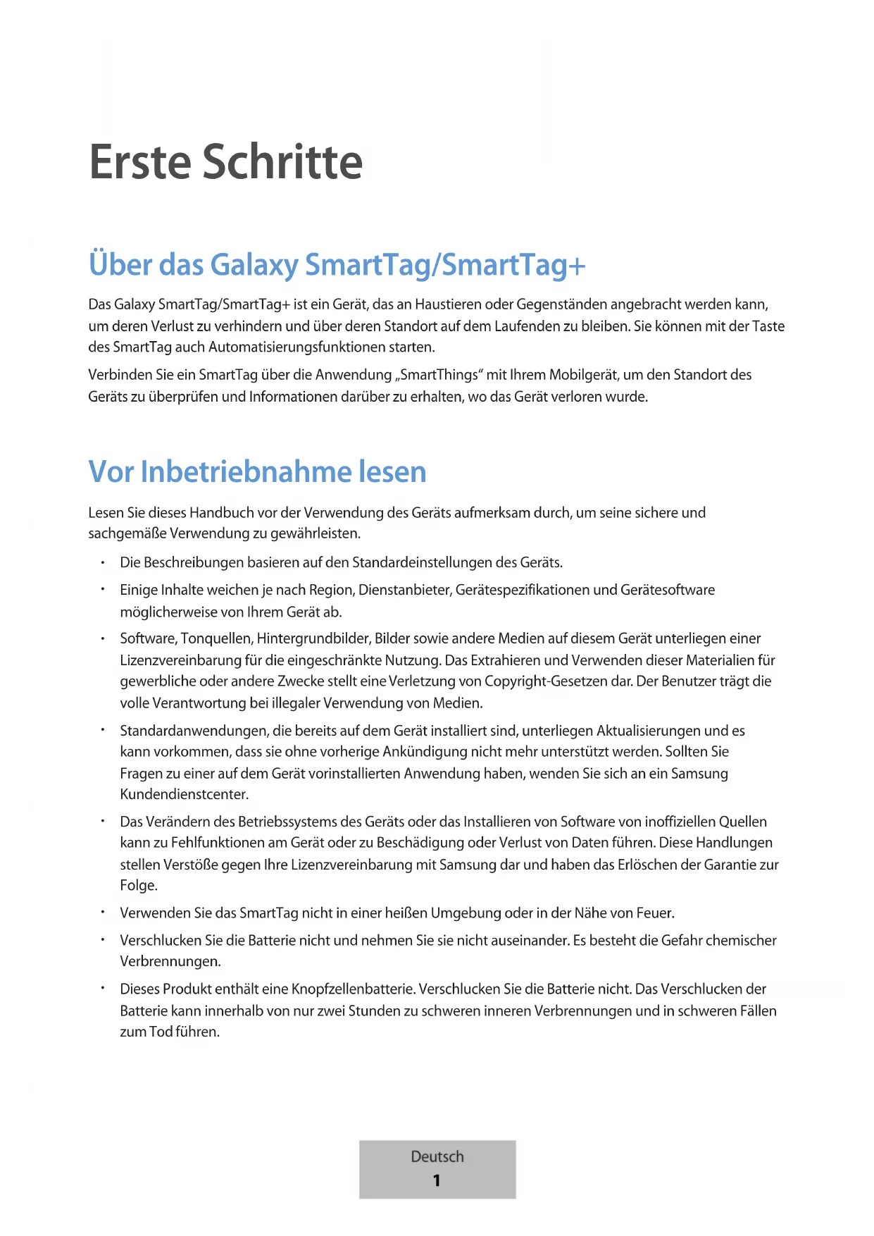 Erste Schritte Über das GalaxySmartTag/SmartTag+ Das Galaxy SmartTag/SmartTag+ ist ein Gerät, das an Haustieren oder Gegenständen angebracht werden kann, um deren Verlust zu verhindern und über deren Standort auf dem Laufenden zu bleiben. Sie können mit der Taste des SmartTag auch Automatisierungsfunktionen starten.Verbinden Sie ein SmartTag über die Anwendung „SmartThings“ mit Ihrem Mobilgerät, um den Standort des Geräts zu überprüfen und Informationen darüber zu erhalten, wo das Gerät verloren wurde. Vor Inbetriebnahme lesen Lesen Sie dieses Handbuch vor der Verwendung des Geräts aufmerksam durch, um seine sichere und sachgemäße Verwendung zu gewährleisten. Die Beschreibungen basieren auf den Standardeinstellungen des Geräts. Einige Inhalte weichen je nach Region, Dienstanbieter, Gerätespezifikationen und Gerätesoftware möglicherweise von Ihrem Gerät ab. Software, Tonquellen, Hintergrundbilder, Bilder sowie andere Medien auf diesem Gerät unterliegen einer Lizenzvereinbarung für die eingeschränkte Nutzung. Das Extrahieren und Verwenden dieser Materialien für gewerbliche oder andere Zwecke stellt eine Verletzung von Copyright-Gesetzen dar. Der Benutzer trägt die volle Verantwortung bei illegaler Verwendung von Medien. Standardanwendungen, die bereits auf dem Gerät installiert sind, unterliegen Aktualisierungen und es kann vorkommen, dass sie ohne vorherige Ankündigung nicht mehr unterstützt werden. Sollten Sie Fragen zu einer auf dem Gerät vorinstallierten Anwendung haben, wenden Sie sich an ein Samsung Kundendienstcenter. Das Verändern des Betriebssystems des Geräts oder das Installieren von Software von inoffiziellen Quellen kann zu Fehlfunktionen am Gerät oder zu Beschädigung oder Verlust von Daten führen. Diese Handlungen stellen Verstöße gegen Ihre Lizenzvereinbarung mit Samsung dar und haben das Erlöschen der Garantie zur Folge. Verwenden Sie das SmartTag nicht in einer heißen Umgebung oder in der Nähe von Feuer. Verschlucken Sie die Batterie nicht und nehmen Sie sie nicht auseinander. Es besteht die Gefahr chemischer Verbrennungen. Dieses Produkt enthält eine Knopfzellenbatterie. Verschlucken Sie die Batterie nicht. Das Verschlucken der Batterie kann innerhalb von nur zwei Stunden zu schweren inneren Verbrennungen und in schweren Fällen zum Tod führen. Deutsch 1Erste Schritte