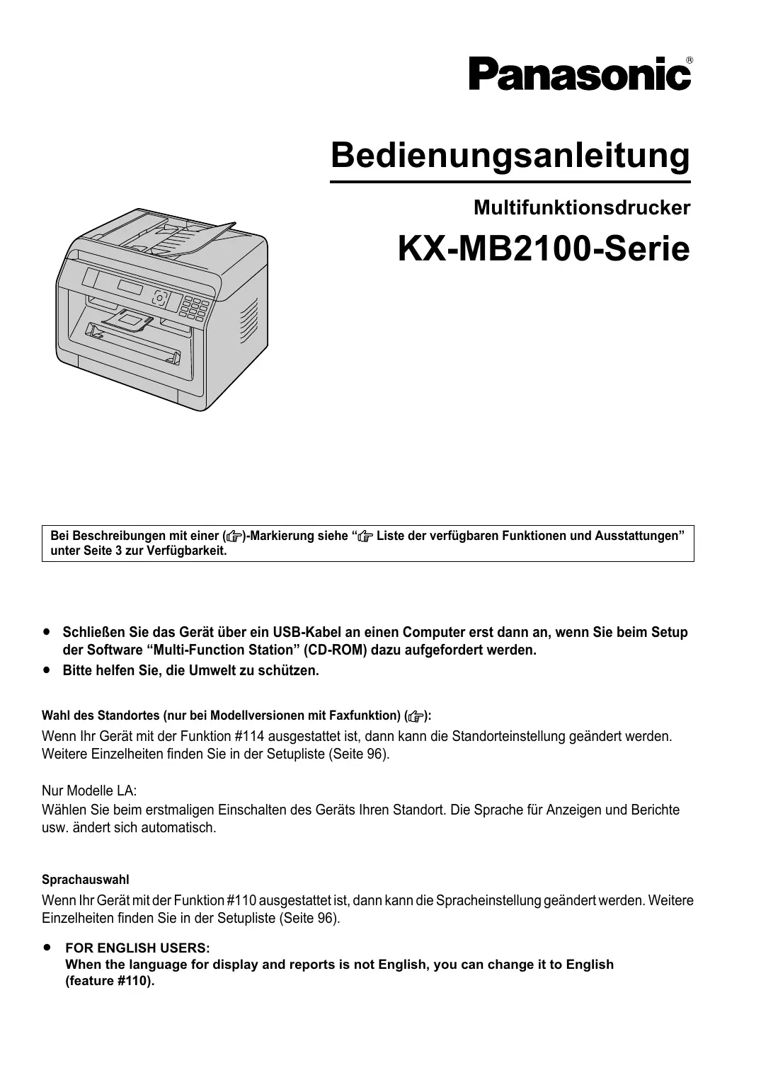 Bedienungsanleitung Multifunktionsdrucker KX-MB2100-Serie Bei Beschreibungen mit einer (y)-Markierung siehe “y Liste der verfügbaren Funktionen und Ausstattungen” unter Seite 3 zur Verfügbarkeit. R Schließen Sie das Gerät über ein USB-Kabel an einen Computer erst dann an, wenn Sie beim Setup der Software “Multi-Function Station” (CD-ROM) dazu aufgefordert werden. R Bitte helfen Sie, die Umwelt zu schützen. Wahl des Standortes (nur bei Modellversionen mit Faxfunktion) (y): Wenn Ihr Gerät mit der Funktion #114 ausgestattet ist, dann kann die Standorteinstellung geändert werden. Weitere Einzelheiten finden Sie in der Setupliste (Seite 96). Nur Modelle LA: Wählen Sie beim erstmaligen Einschalten des Geräts Ihren Standort. Die Sprache für Anzeigen und Berichte usw. ändert sich automatisch. Sprachauswahl Wenn Ihr Gerät mit der Funktion #110 ausgestattet ist, dann kann die Spracheinstellung geändert werden. Weitere Einzelheiten finden Sie in der Setupliste (Seite 96). R FOR ENGLISH USERS: When the language for display and reports is not English, you can change it to English (feature #110). Vielen Dank, dass Sie sich für den Kauf dieses Panasonic-Geräts entschieden haben. Vorsicht: R Reiben oder Radieren auf der bedruckten Seite des Papiers kann dazu führen, dass der Druck verschmiert. Modelle in dieser Anleitung: Hinweis zu Entsorgung, Übertragung und Rückgabe des Produkts (nur bei Modellversionen mit Fax- oder Netzwerkfunktion) (y): R In dem Produkt können private/vertrauliche Informationen gespeichert werden. Zum Schutz Ihrer privaten/ vertraulichen Daten empfehlen wir, die Informationen aus dem Speicher zu löschen, bevor Sie das Produkt entsorgen, übertragen oder zurückgeben (Funktion #159). Suffix