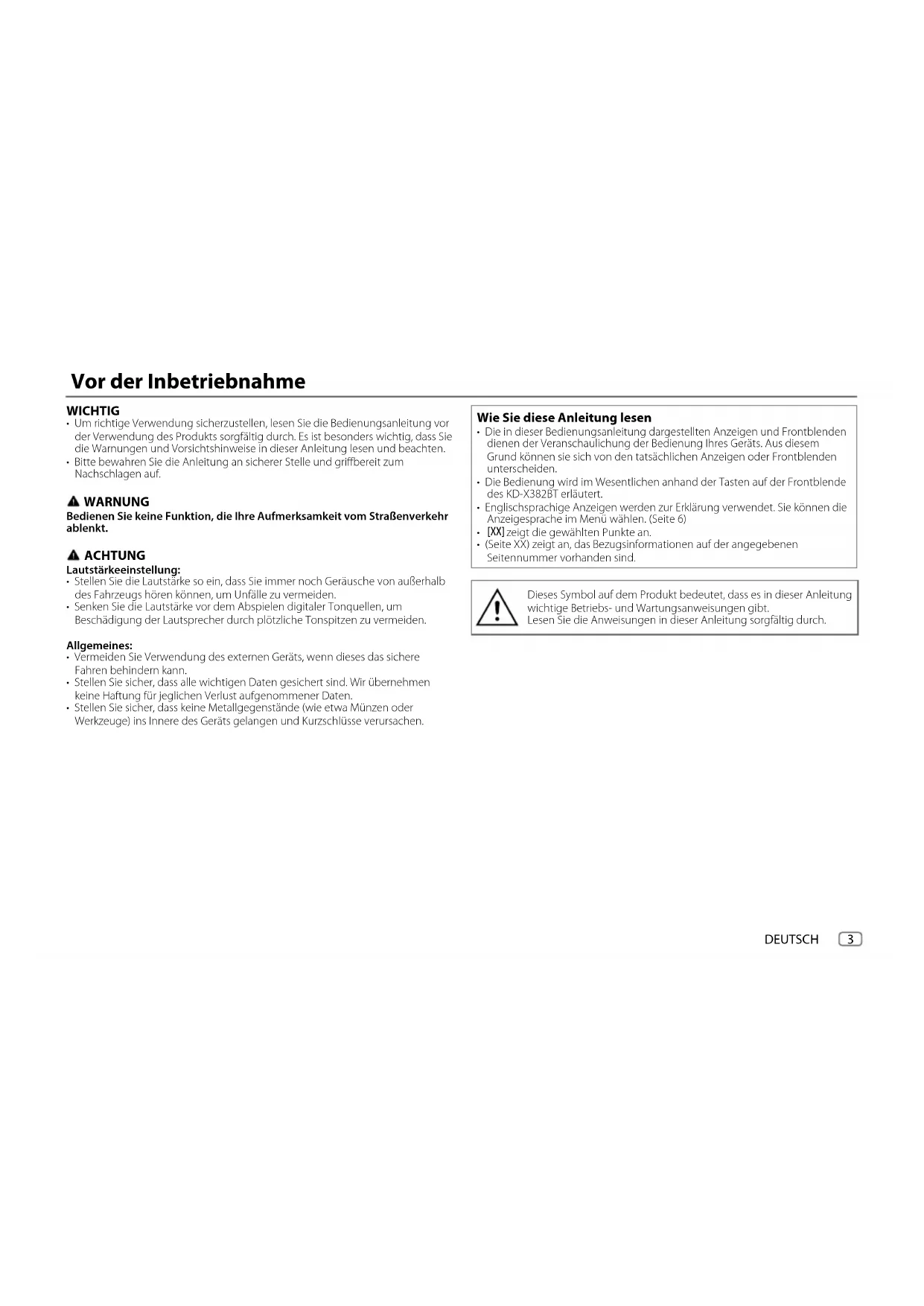 - (Seite XX) zeigt an, das Bezugsinformationen auf der angegebenen Seitennummer vorhanden sind. Dieses Symbol auf dem Produkt bedeutet, dass es in dieser Anleitung wichtige Betriebs- und Wartungsanweisungen gibt. Lesen Sie die Anweisungen in dieser Anleitung sorgfältig durch. KD-X382BT_E_GE.indd 3KD-X382BT_E_GE.indd 3 8/4/2022 5:08:20 PM8/4/2022 5:08:20 PM4 DEUTSCH Data Size: B6L (182 mm x 128 mm) Book Size: B6L (182 mm x 128 mm) Grundlagen Frontblende Zum Auf der Frontblende Einschalten Drücken Sie B SRC.