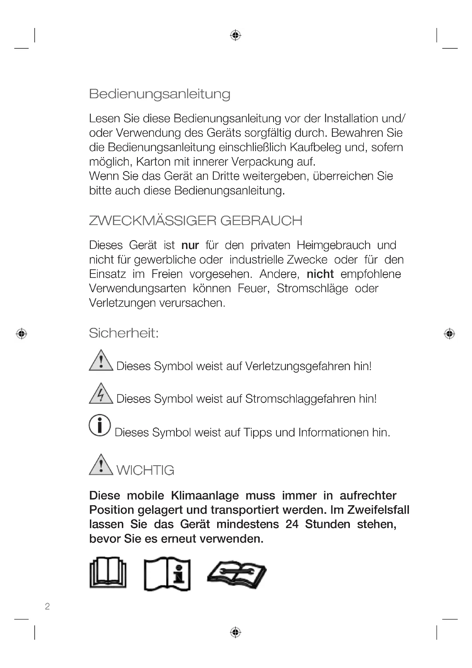 Dieses Gerät ist nur für den privaten Heimgebrauch und nicht für gewerbliche oder industrielle Zwecke oder für den Einsatz im Freien vorgesehen. Andere, nicht empfohlene Verwendungsarten können Feuer, Stromschläge oder Verletzungen verursachen. Sicherheit: Dieses Symbol weist auf Verletzungsgefahren hin! Dieses Symbol weist auf Stromschlaggefahren hin! Dieses Symbol weist auf Tipps und Informationen hin. WICHTIG Diese mobile Klimaanlage muss immer in aufrechter Position gelagert und transportiert werden. Im Zweifelsfall lassen Sie das Gerät mindestens 24 Stunden stehen, bevor Sie es erneut verwenden.DEUTSCH Bedienungsanleitung