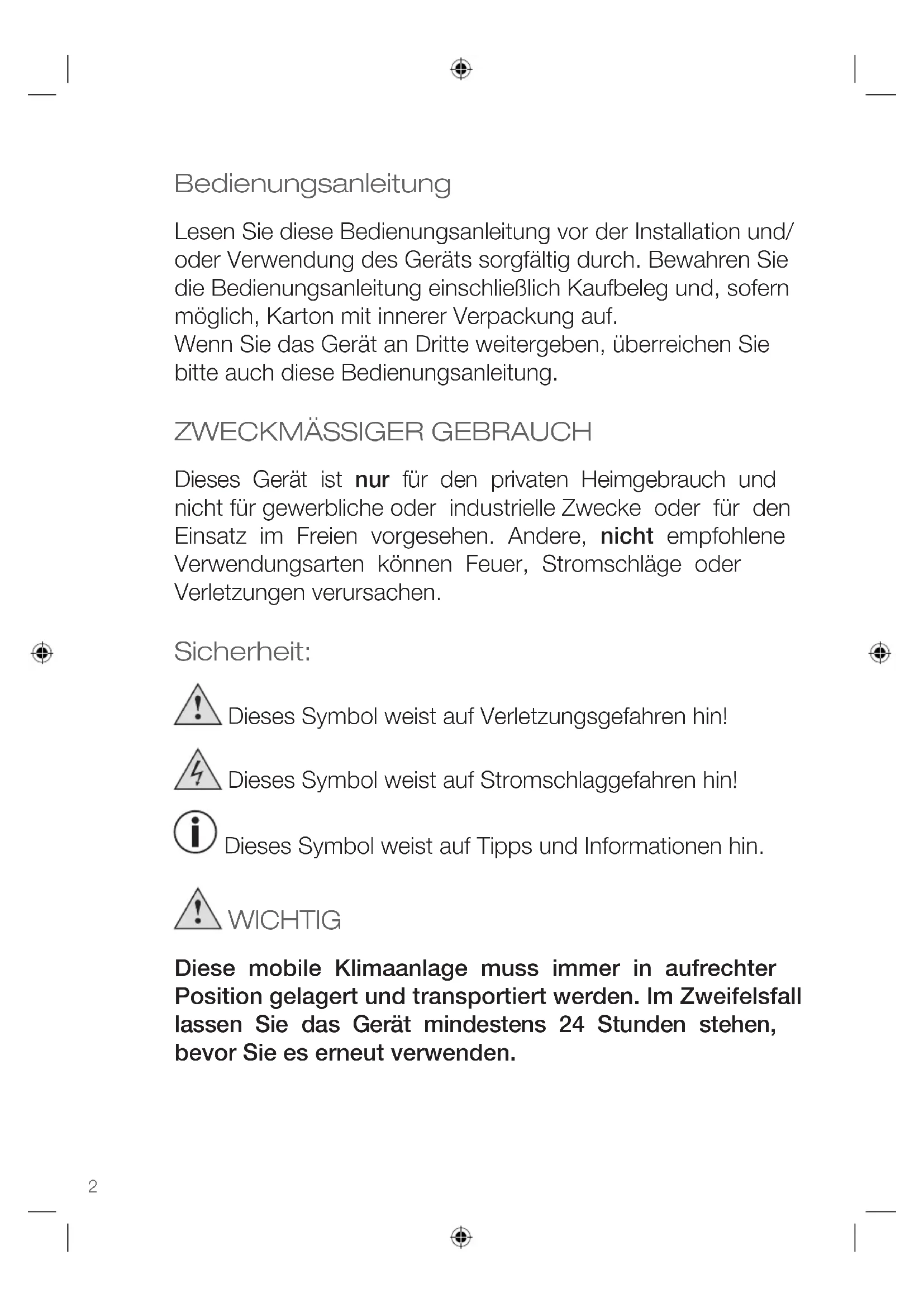 - Verwenden Sie das Gerät nur zweckgemäß und im Einklang mit dieser Bedienungsanleitung.
