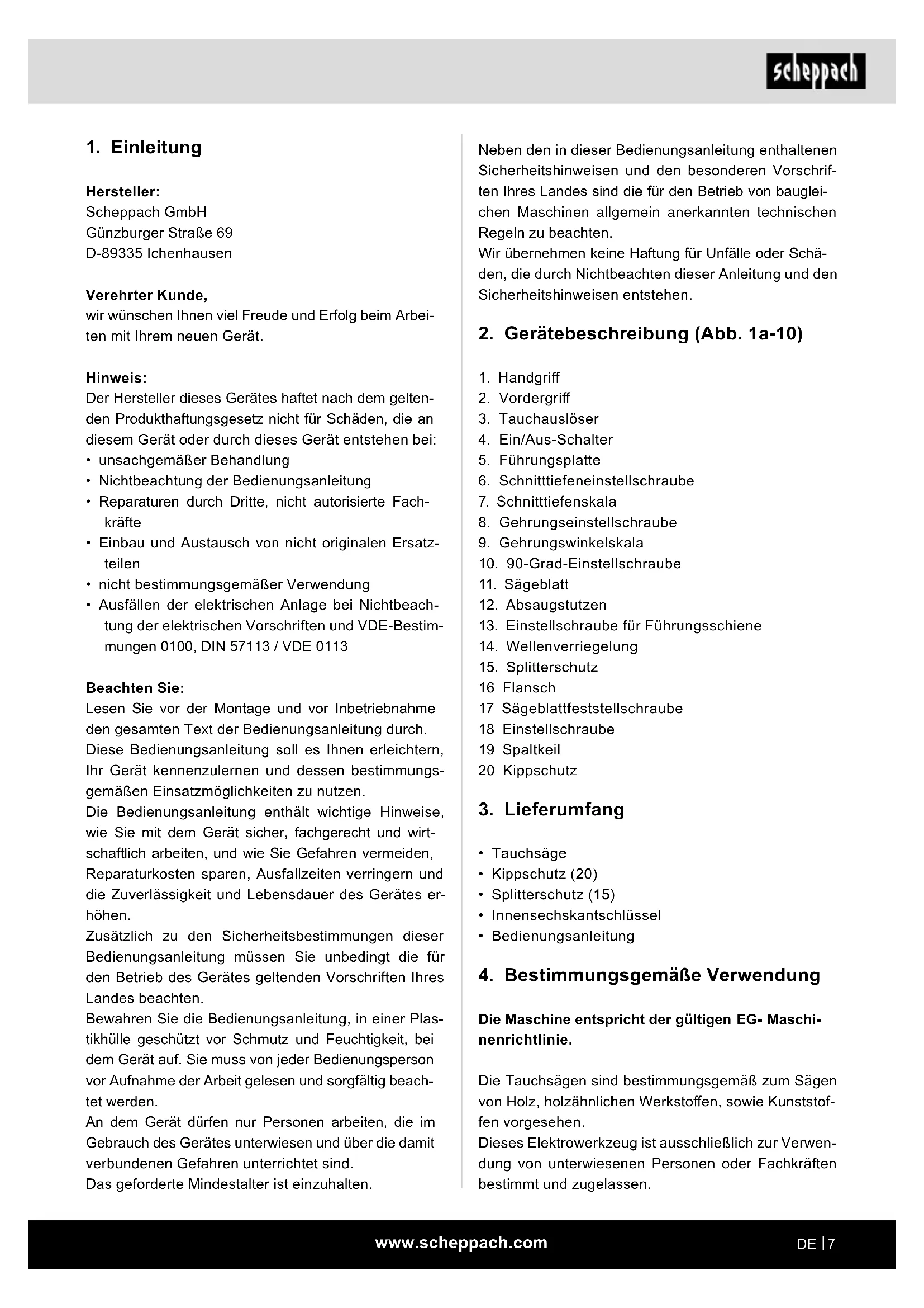Hersteller: Scheppach GmbH Günzburger Straße 69 D-89335 Ichenhausen Verehrter Kunde, wir wünschen Ihnen viel Freude und Erfolg beim Arbei- ten mit Ihrem neuen Gerät. Hinweis: Der Hersteller dieses Gerätes haftet nach dem gelten- den Produkthaftungsgesetz nicht für Schäden, die an diesem Gerät oder durch dieses Gerät entstehen bei: