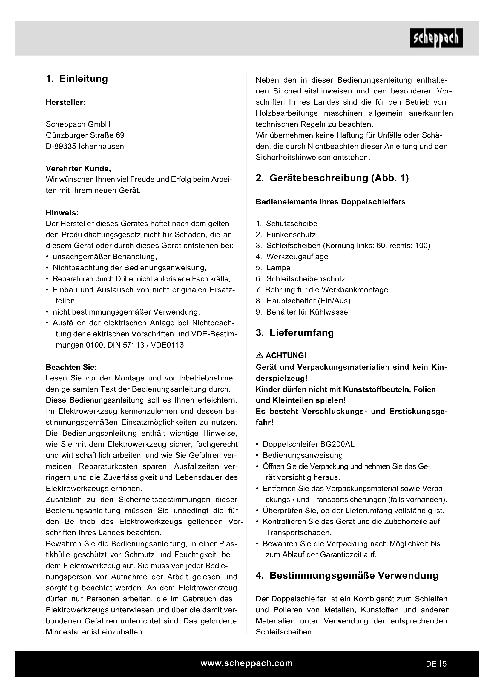Hersteller: Scheppach GmbH Günzburger Straße 69 D-89335 Ichenhausen Verehrter Kunde, Wir wünschen Ihnen viel Freude und Erfolg beim Arbei- ten mit Ihrem neuen Gerät. Hinweis: Der Hersteller dieses Gerätes haftet nach dem gelten- den Produkthaftungsgesetz nicht für Schäden, die an diesem Gerät oder durch dieses Gerät entstehen bei:
