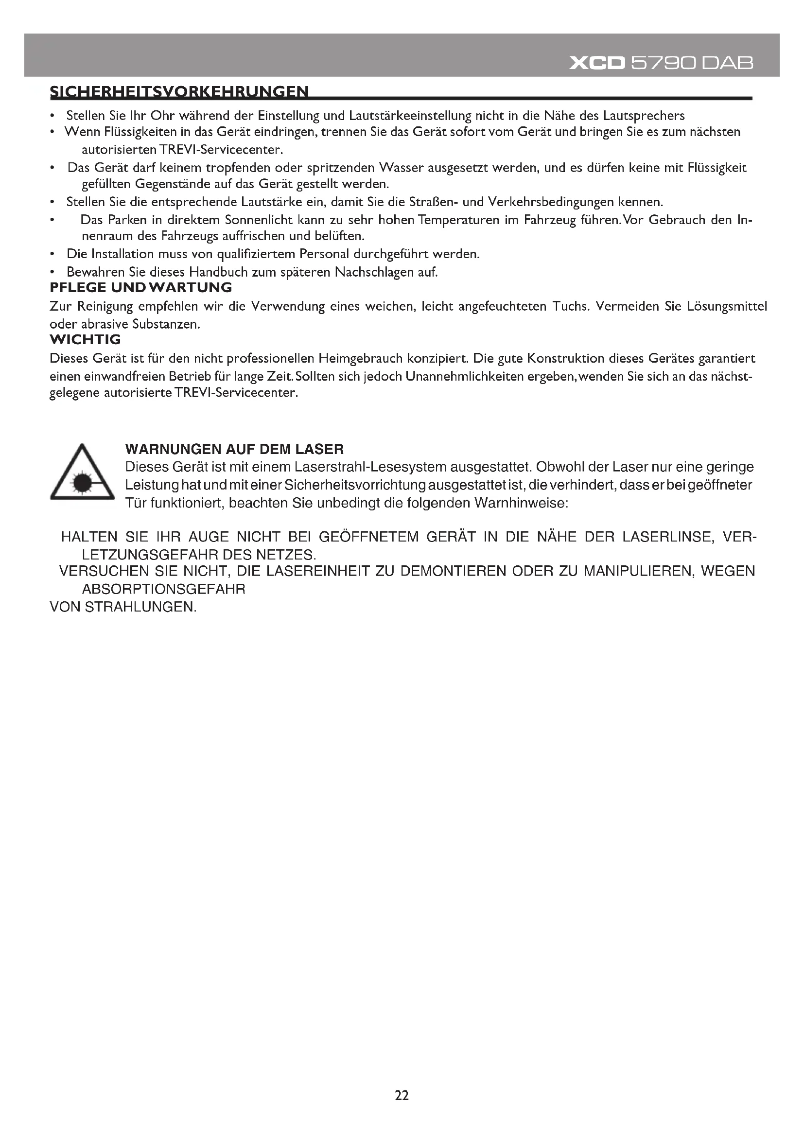 Zur Reinigung empfehlen wir die Verwendung eines weichen, leicht angefeuchteten Tuchs. Vermeiden Sie Lösungsmittel oder abrasive Substanzen. WICHTIG Dieses Gerät ist für den nicht professionellen Heimgebrauch konzipiert. Die gute Konstruktion dieses Gerätes garantiert einen einwandfreien Betrieb für lange Zeit. Sollten sich jedoch Unannehmlichkeiten ergeben, wenden Sie sich an das nächst- gelegene autorisierte TREVI-Servicecenter.23 XCD 5790 DAB