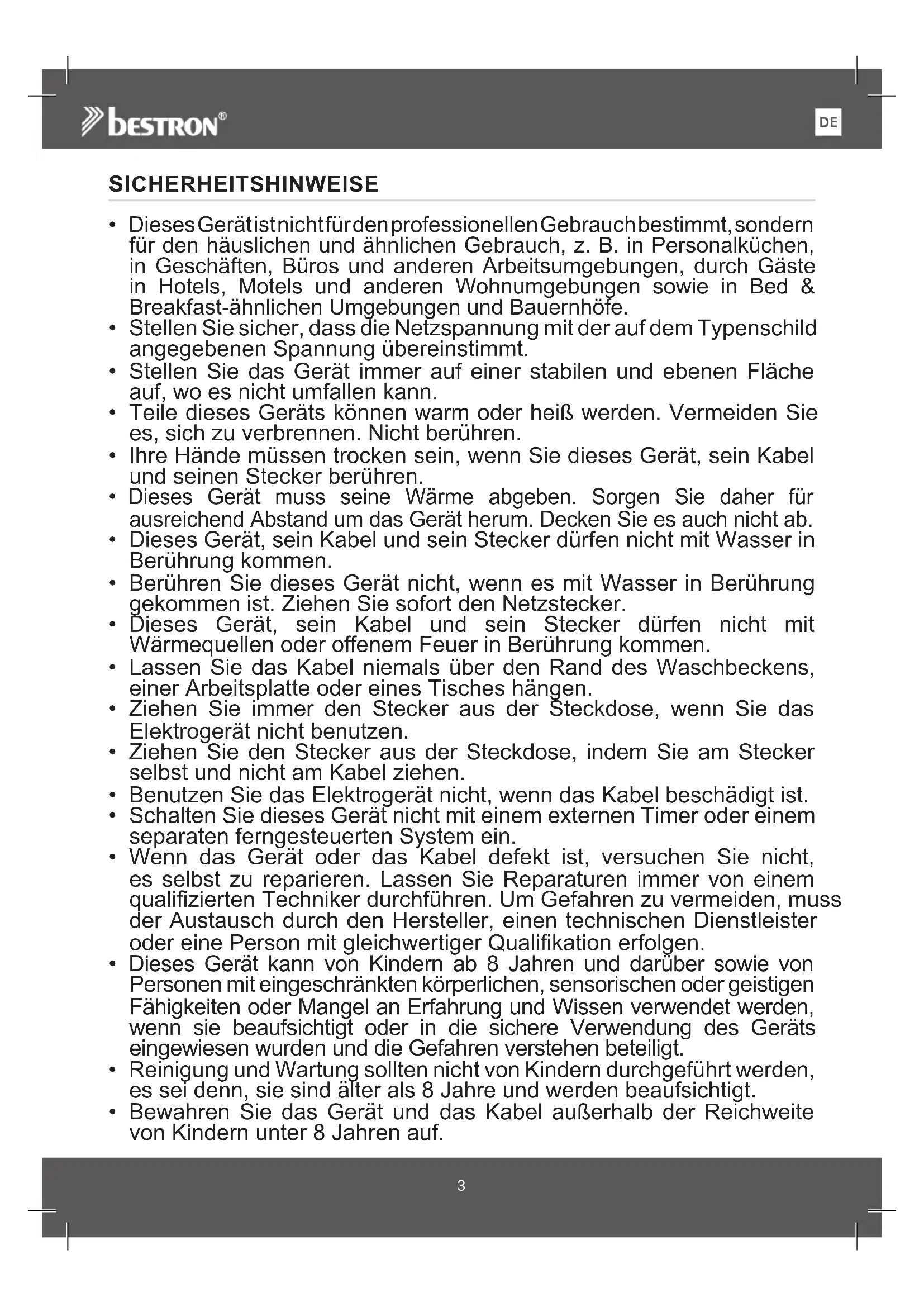 - Informieren Sie sich bei der Gemeinde nach der richtigen Sammelstelle bei Ihnen in der Nähe. SERVICE Im unwahrscheinlichen Fall einer Fehlfunktion wenden Sie sich bitte an den Kundendienst von Bestron: www.bestron.com/service Technische Daten Modell ACM900BW Spannung 220-240V~ Frequenz (Hz) 50/60 Schutzklasse 1 Leistung (Watt) 1000 Geräusch (dB(A)) - Max. Fassungsvermögen - Kurzzeitbetrieb (KB) - Geräteabmessung (L x W x H) (cm) 24,6x16,6x34,2 Länge des Netzkabels (cm) 935