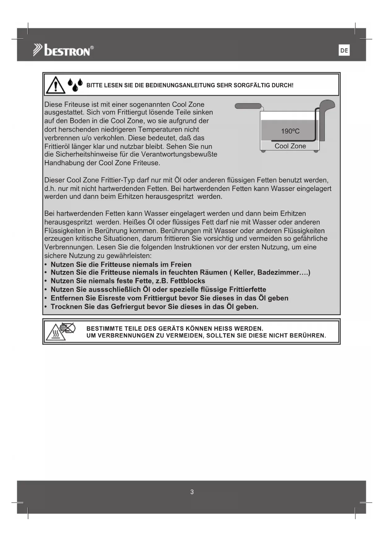 BITTE LESEN SIE DIE BEDIENUNGSANLEITUNG SEHR SORGFÄLTIG DURCH! BESTIMMTE TEILE DES GERÄTS KÖNNEN HEISS WERDEN. UM VERBRENNUNGEN ZU VERMEIDEN, SOLLTEN SIE DIESE NICHT BERÜHREN. 190ºC Cool Zone Diese Friteuse ist mit einer sogenannten Cool Zone ausgestattet. Sich vom Frittiergut lösende Teile sinken auf den Boden in die Cool Zone, wo sie aufgrund der dort herschenden niedrigeren Temperaturen nicht verbrennen u/o verkohlen. Diese bedeutet, daß das Frittieröl länger klar und nutzbar bleibt. Sehen Sie nun die Sicherheitshinweise für die Verantwortungsbewußte Handhabung der Cool Zone Friteuse. Dieser Cool Zone Frittier-Typ darf nur mit Öl oder anderen flüssigen Fetten benutzt werden, d.h. nur mit nicht hartwerdenden Fetten. Bei hartwerdenden Fetten kann Wasser eingelagert werden und dann beim Erhitzen herausgespritzt werden. Bei hartwerdenden Fetten kann Wasser eingelagert werden und dann beim Erhitzen herausgespritzt werden. Heißes Öl oder flüssiges Fett darf nie mit Wasser oder anderen Flüssigkeiten in Berührung kommen. Berührungen mit Wasser oder anderen Flüssigkeiten erzeugen kritische Situationen, darum frittieren Sie vorsichtig und vermeiden so gefährliche Verbrennungen. Lesen Sie die folgenden Instruktionen vor der ersten Nutzung, um eine sichere Nutzung zu gewährleisten: