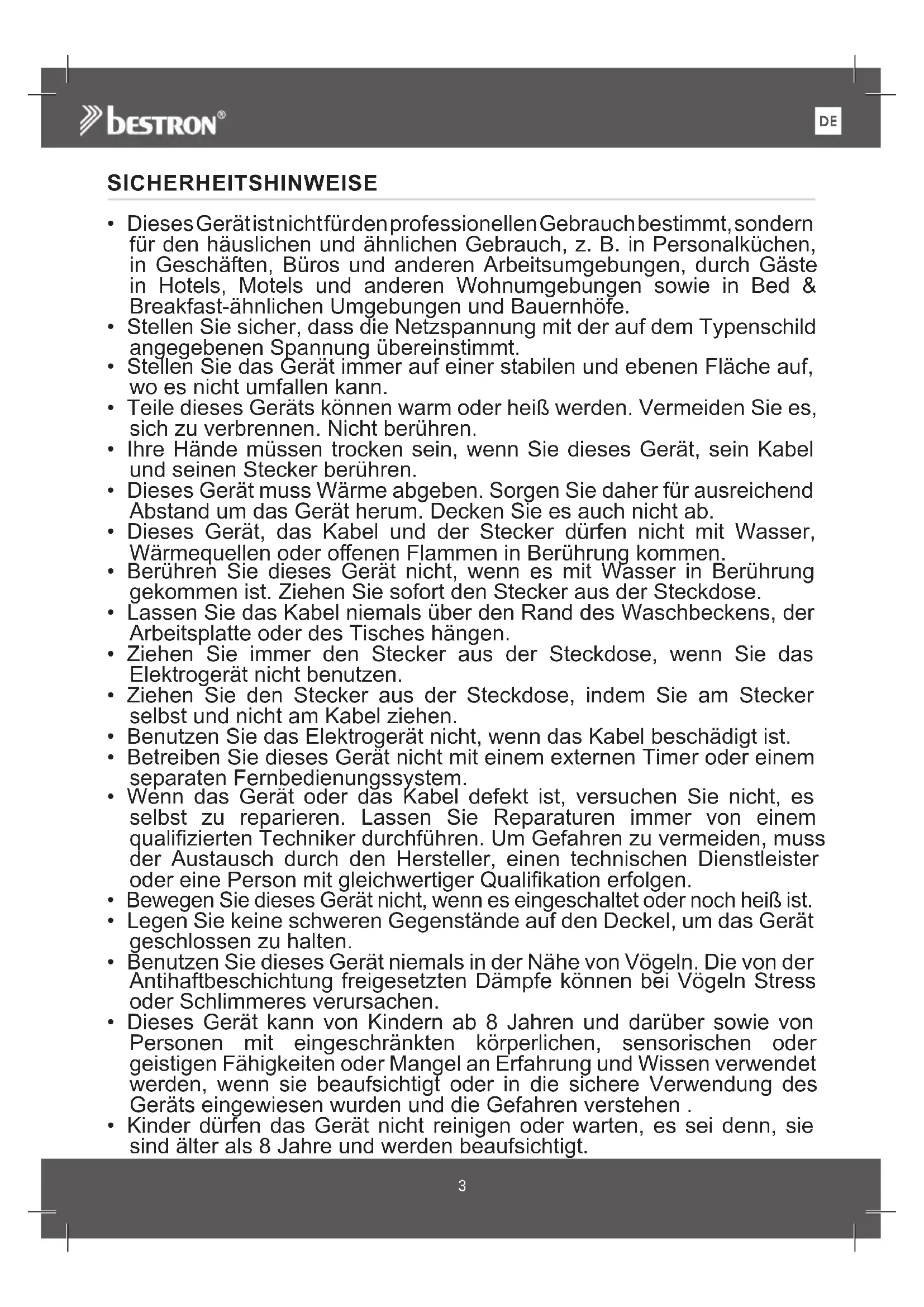 - Informieren Sie sich bei der Gemeinde nach der richtigen Sammelstelle bei Ihnen in der Nähe. SERVICE Im unwahrscheinlichen Fall einer Fehlfunktion wenden Sie sich bitte an den Kundendienst von Bestron: www.bestron.com/service Technische Daten Modell ADWM730CO Spannung 220-240V Frequenz (Hz) 50/60 Schutzklasse I Leistung (Watt) 1200 Geräusch (dB(A)) - Max. Fassungsvermögen - Kurzzeitbetrieb (KB) - Geräteabmessung (Höhe x Breite x Tiefe) (cm) 17,5x38,0x33,0 Länge des Netzkabels (cm) 70