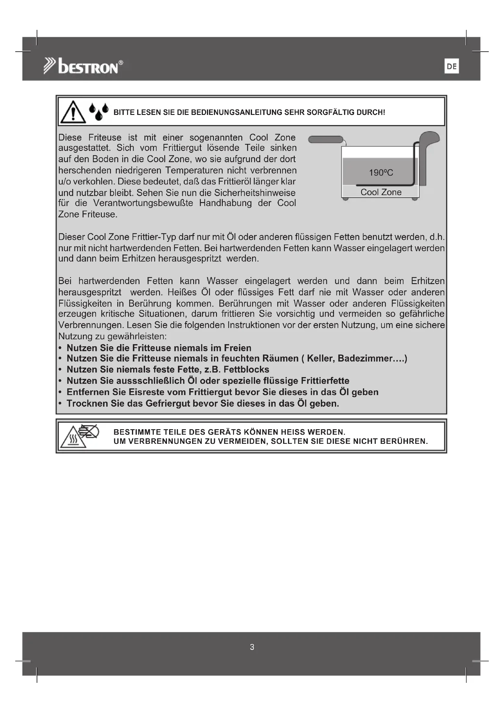 BITTE LESEN SIE DIE BEDIENUNGSANLEITUNG SEHR SORGFÄLTIG DURCH! BESTIMMTE TEILE DES GERÄTS KÖNNEN HEISS WERDEN. UM VERBRENNUNGEN ZU VERMEIDEN, SOLLTEN SIE DIESE NICHT BERÜHREN. 190ºC Cool Zone Diese Friteuse ist mit einer sogenannten Cool Zone ausgestattet. Sich vom Frittiergut lösende Teile sinken auf den Boden in die Cool Zone, wo sie aufgrund der dort herschenden niedrigeren Temperaturen nicht verbrennen u/o verkohlen. Diese bedeutet, daß das Frittieröl länger klar und nutzbar bleibt. Sehen Sie nun die Sicherheitshinweise für die Verantwortungsbewußte Handhabung der Cool Zone Friteuse. Dieser Cool Zone Frittier-Typ darf nur mit Öl oder anderen flüssigen Fetten benutzt werden, d.h. nur mit nicht hartwerdenden Fetten. Bei hartwerdenden Fetten kann Wasser eingelagert werden und dann beim Erhitzen herausgespritzt werden. Bei hartwerdenden Fetten kann Wasser eingelagert werden und dann beim Erhitzen herausgespritzt werden. Heißes Öl oder flüssiges Fett darf nie mit Wasser oder anderen Flüssigkeiten in Berührung kommen. Berührungen mit Wasser oder anderen Flüssigkeiten erzeugen kritische Situationen, darum frittieren Sie vorsichtig und vermeiden so gefährliche Verbrennungen. Lesen Sie die folgenden Instruktionen vor der ersten Nutzung, um eine sichere Nutzung zu gewährleisten: