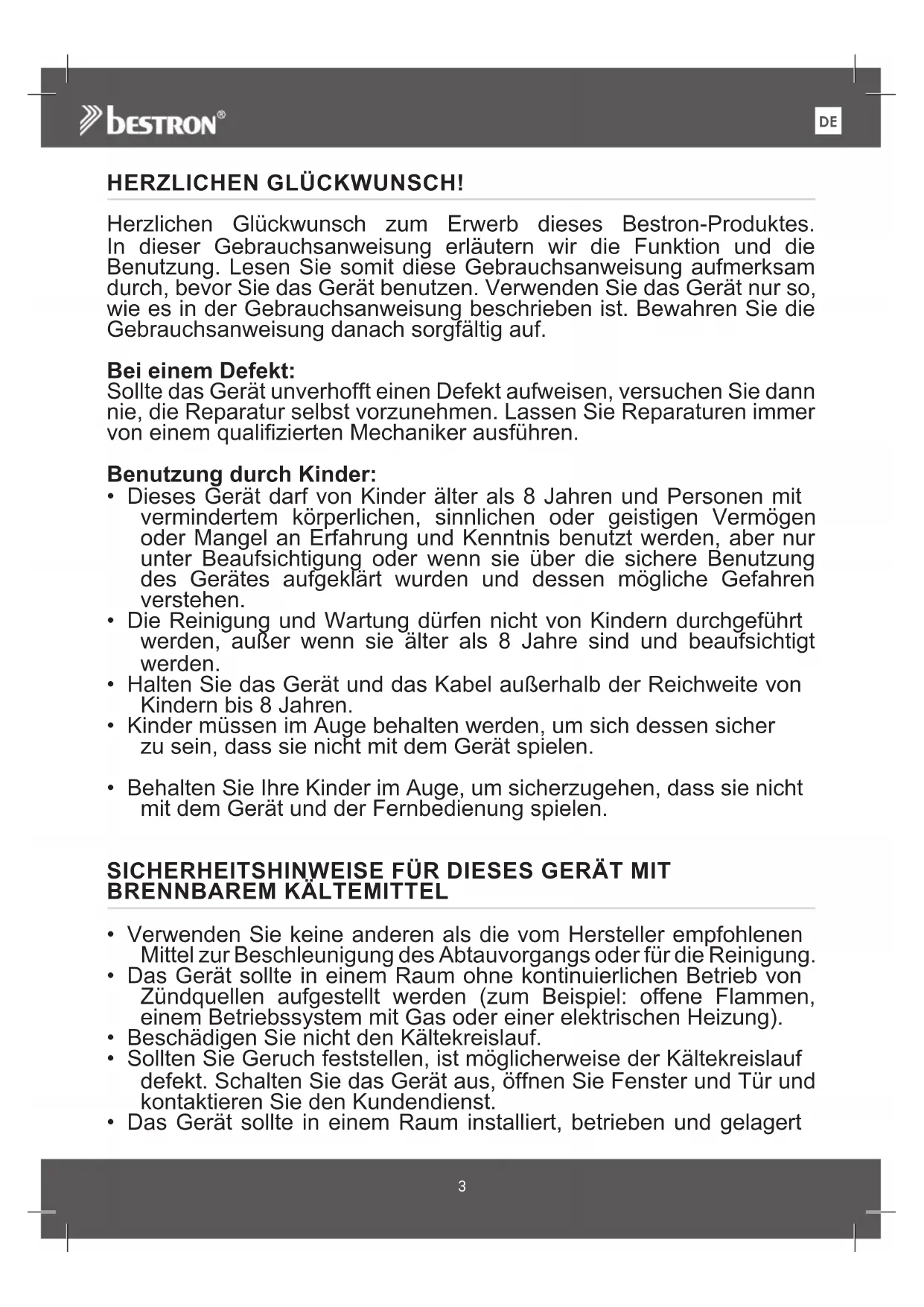 HERZLICHEN GLÜCKWUNSCH! Herzlichen Glückwunsch zum Erwerb dieses Bestron-Produktes. In dieser Gebrauchsanweisung erläutern wir die Funktion und die Benutzung. Lesen Sie somit diese Gebrauchsanweisung aufmerksam durch, bevor Sie das Gerät benutzen. Verwenden Sie das Gerät nur so, wie es in der Gebrauchsanweisung beschrieben ist. Bewahren Sie die Gebrauchsanweisung danach sorgfältig auf. Bei einem Defekt: Sollte das Gerät unverhofft einen Defekt aufweisen, versuchen Sie dann nie, die Reparatur selbst vorzunehmen. Lassen Sie Reparaturen immer von einem qualifizierten Mechaniker ausführen. Benutzung durch Kinder: