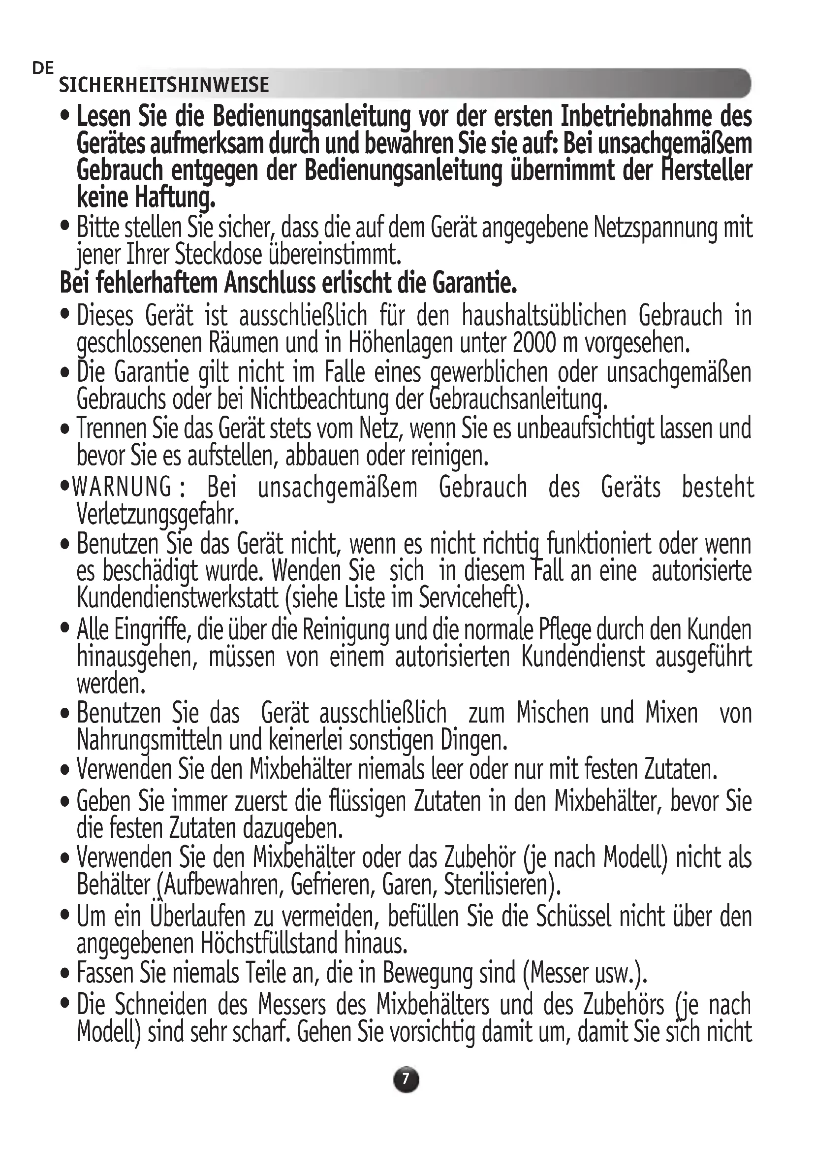 Benutzen Sie das Gerät ausschließlich zum Mischen und Mixen von Nahrungsmitteln und keinerlei sonstigen Dingen.