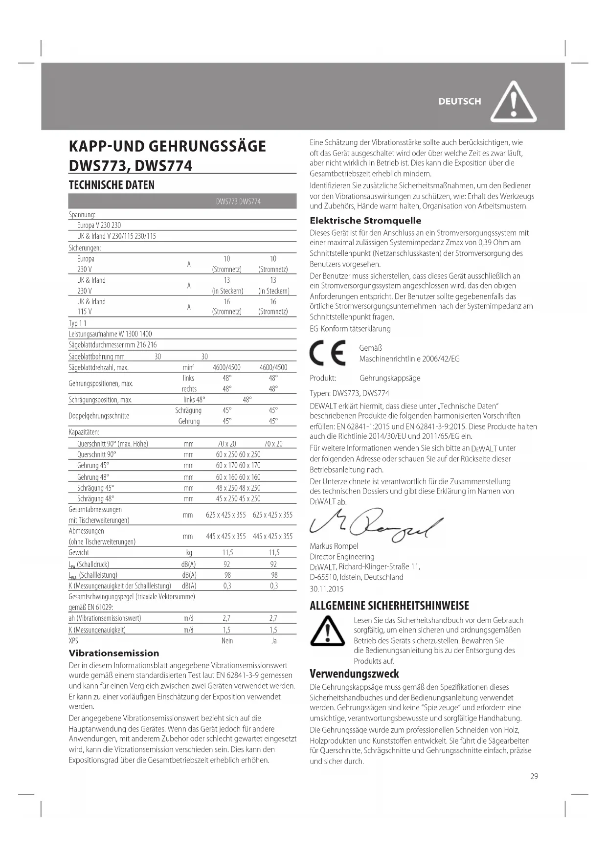 1,5 1,5 XPS Nein Ja Vibrationsemission Der in diesem Informationsblatt angegebene Vibrationsemissionswert wurde gemäß einem standardisierten Test laut EN 62841-3-9 gemessen und kann für einen Vergleich zwischen zwei Geräten verwendet werden. Er kann zu einer vorläufigen Einschätzung der Exposition verwendet werden. Der angegebene Vibrationsemissionswert bezieht sich auf die Hauptanwendung des Gerätes. Wenn das Gerät jedoch für andere Anwendungen, mit anderem Zubehör oder schlecht gewartet eingesetzt wird, kann die Vibrationsemission verschieden sein. Dies kann den Expositionsgrad über die Gesamtbetriebszeit erheblich erhöhen. Eine Schätzung der Vibrationsstärke sollte auch berücksichtigen, wie oft das Gerät ausgeschaltet wird oder über welche Zeit es zwar läuft, aber nicht wirklich in Betrieb ist. Dies kann die Exposition über die Gesamtbetriebszeit erheblich mindern. Identifizieren Sie zusätzliche Sicherheitsmaßnahmen, um den Bediener vor den Vibrationsauswirkungen zu schützen, wie: Erhalt des Werkzeugs und Zubehörs, Hände warm halten, Organisation von Arbeitsmustern. Elektrische Stromquelle Dieses Gerät ist für den Anschluss an ein Stromversorgungssystem mit einer maximal zulässigen Systemimpedanz Zmax von 0,39 Ohm am Schnittstellenpunkt (Netzanschlusskasten) der Stromversorgung des Benutzers vorgesehen. Der Benutzer muss sicherstellen, dass dieses Gerät ausschließlich an ein Stromversorgungssystem angeschlossen wird, das den obigen Anforderungen entspricht. Der Benutzer sollte gegebenenfalls das örtliche Stromversorgungsunternehmen nach der Systemimpedanz am Schnittstellenpunkt fragen. EG-Konformitätserklärung Gemäß Maschinenrichtlinie 2006/42/EG Produkt: Gehrungskappsäge Typen: DWS773, DWS774 DEWALT erklärt hiermit, dass diese unter „Technische Daten“ beschriebenen Produkte die folgenden harmonisierten Vorschriften erfüllen: EN 62841-1:2015 und EN 62841-3-9:2015. Diese Produkte halten auch die Richtlinie 2014/30/EU und 2011/65/EG ein. Für weitere Informationen wenden Sie sich bitte an DeWALT unter der folgenden Adresse oder schauen Sie auf der Rückseite dieser Betriebsanleitung nach. Der Unterzeichnete ist verantwortlich für die Zusammenstellung des technischen Dossiers und gibt diese Erklärung im Namen von DeWALT ab. Markus Rompel Director Engineering DeWALT , Richard-Klinger-Straße 11, D-65510, Idstein, Deutschland