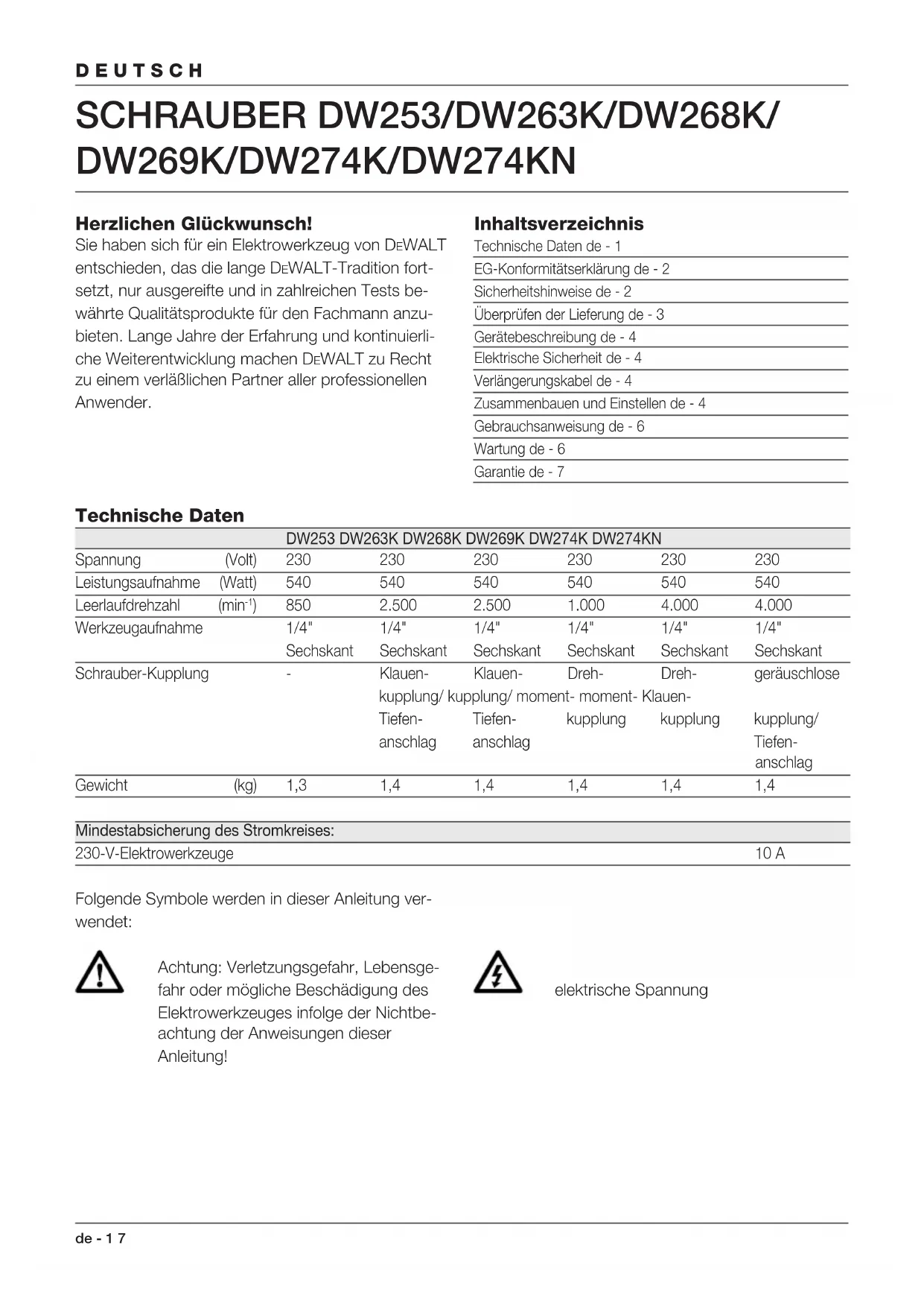) 850 2.500 2.500 1.000 4.000 4.000 Werkzeugaufnahme 1/4" 1/4" 1/4" 1/4" 1/4" 1/4" Sechskant Sechskant Sechskant Sechskant Sechskant Sechskant Schrauber-Kupplung - Klauen- Klauen- Dreh- Dreh- geräuschlose kupplung/ kupplung/ moment- moment- Klauen- Tiefen- Tiefen- kupplung kupplung kupplung/ anschlag anschlag Tiefen- anschlag Gewicht (kg) 1,3 1,4 1,4 1,4 1,4 1,4 Mindestabsicherung des Stromkreises: 230-V-Elektrowerkzeuge 10 A Folgende Symbole werden in dieser Anleitung ver- wendet: Achtung: Verletzungsgefahr, Lebensge- fahr oder mögliche Beschädigung des Elektrowerkzeuges infolge der Nichtbe- achtung der Anweisungen dieser Anleitung! elektrische SpannungDEUTSCH 8 de - 2 EG-Konformitätserklärung DW253/DW263K/DW268K/DW269K/DW274K/ DW274KN DEWALT erklärt hiermit, daß diese Elektrowerkzeuge entsprechend den Richtlinien und Normen 89/392/EWG, 89/336/EWG, 73/23/EWG, EN 50144, EN 55104 / EN 55014-2, EN 55014, EN 61000-3-2 und EN 61000-3-3 konzipiert wurden. Für weitere Informationen wenden Sie sich bitte an die Adresse weiter unten oder an eine der auf der Rückseite dieser Anleitung genannten Niederlassun- gen. Die Höhe des Schalldrucks entspricht den Richtlini- en der Europäischen Gemeinschaft 86/188/EWG und 89/392/EWG gemessen nach EN 50144: DW253 DW263K DW268K DW269K DW274K DW274KN