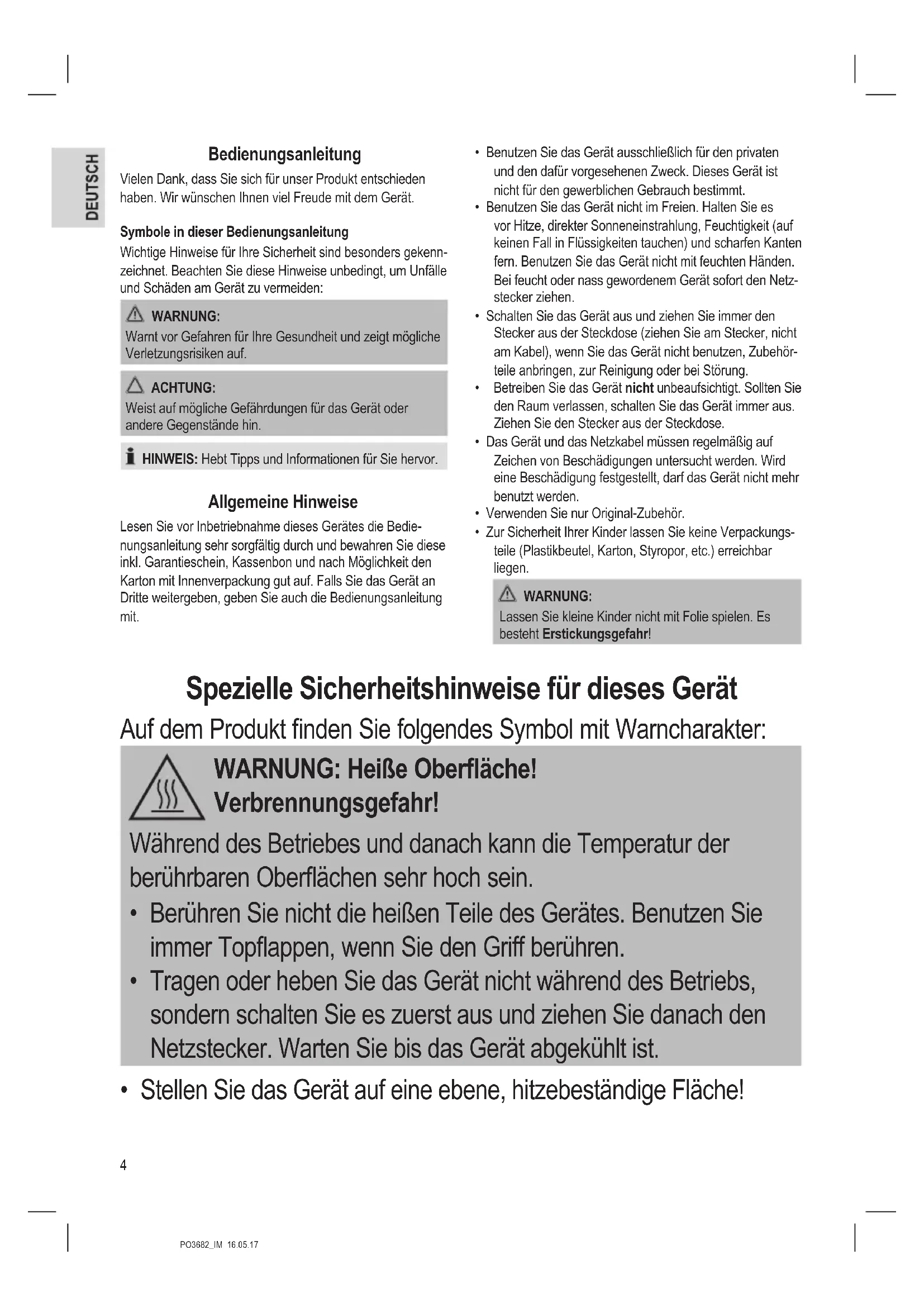 PO3682_IM 16.05.173 Übersicht der Bedienelemente Overzicht van de bedieningselementen • Liste des différents éléments de commande Indicación de los elementos de manejo • Elementi di comando • Overview of the Components Przegląd elementów obsługi • A kezelőelemek áttekintése Обзор деталей прибора • PO3682_IM 16.05.174 PO3682_IM 16.05.17 Bedienungsanleitung Vielen Dank, dass Sie sich für unser Produkt entschieden haben. Wir wünschen Ihnen viel Freude mit dem Gerät. Symbole in dieser Bedienungsanleitung Wichtige Hinweise für Ihre Sicherheit sind besonders gekenn- zeichnet. Beachten Sie diese Hinweise unbedingt, um Unfälle und Schäden am Gerät zu vermeiden: WARNUNG: Warnt vor Gefahren für Ihre Gesundheit und zeigt mögliche Verletzungsrisiken auf. ACHTUNG: Weist auf mögliche Gefährdungen für das Gerät oder andere Gegenstände hin. HINWEIS: Hebt Tipps und Informationen für Sie hervor. Allgemeine Hinweise Lesen Sie vor Inbetriebnahme dieses Gerätes die Bedie- nungsanleitung sehr sorgfältig durch und bewahren Sie diese inkl. Garantieschein, Kassenbon und nach Möglichkeit den Karton mit Innenverpackung gut auf. Falls Sie das Gerät an Dritte weitergeben, geben Sie auch die Bedienungsanleitung mit.