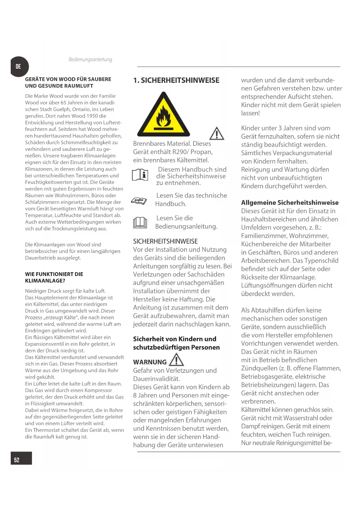 Brennbares Material. Dieses Gerät enthält R290/ Propan, ein brennbares Kältemittel. Diesem Handbuch sind die Sicherheitshinweise zu entnehmen. Lesen Sie das technische Handbuch. Lesen Sie die Bedienungsanleitung. SICHERHEITSHINWEISE Vor der Installation und Nutzung des Geräts sind die beiliegenden Anleitungen sorgfältig zu lesen. Bei Verletzungen oder Sachschäden aufgrund einer unsachgemäßen Installation übernimmt der Hersteller keine Haftung. Die Anleitung ist zusammen mit dem Gerät aufzubewahren, damit man jederzeit darin nachschlagen kann. Sicherheit von Kindern und schutzbedürftigen Personen WARNUNG Gefahr von Verletzungen und Dauerinvalidität. Dieses Gerät kann von Kindern ab 8 Jahren und Personen mit einge- schränkten körperlichen, sensori- schen oder geistigen Fähigkeiten oder mangelnden Erfahrungen und Kenntnissen benutzt werden, wenn sie in der sicheren Hand- habung der Geräte unterwiesen wurden und die damit verbunde- nen Gefahren verstehen bzw. unter entsprechender Aufsicht stehen. Kinder nicht mit dem Gerät spielen lassen! Kinder unter 3 Jahren sind vom Gerät fernzuhalten, sofern sie nicht ständig beaufsichtigt werden. Sämtliches Verpackungsmaterial von Kindern fernhalten. Reinigung und Wartung dürfen nicht von unbeaufsichtigten Kindern durchgeführt werden. Allgemeine Sicherheitshinweise Dieses Gerät ist für den Einsatz in Haushaltsbereichen und ähnlichen Umfeldern vorgesehen, z. B.: Familienzimmer, Wohnzimmer, Küchenbereiche der Mitarbeiter in Geschäften, Büros und anderen Arbeitsbereichen. Das Typenschild bendet sich auf der Seite oder Rückseite der Klimaanlage. Lüftungsönungen dürfen nicht überdeckt werden. Als Abtauhilfen dürfen keine mechanischen oder sonstigen Geräte, sondern ausschließlich die vom Hersteller empfohlenen Vorrichtungen verwendet werden. Das Gerät nicht in Räumen mit in Betrieb bendlichen Zündquellen (z. B. oene Flammen, Betriebsgasgeräte, elektrische Betriebsheizungen) lagern. Das Gerät nicht anstechen oder verbrennen. Kältemittel können geruchlos sein. Gerät nicht mit Wasserstrahl oder Dampf reinigen. Gerät mit einem feuchten, weichen Tuch reinigen. Nur neutrale Reinigungsmittel be-DE