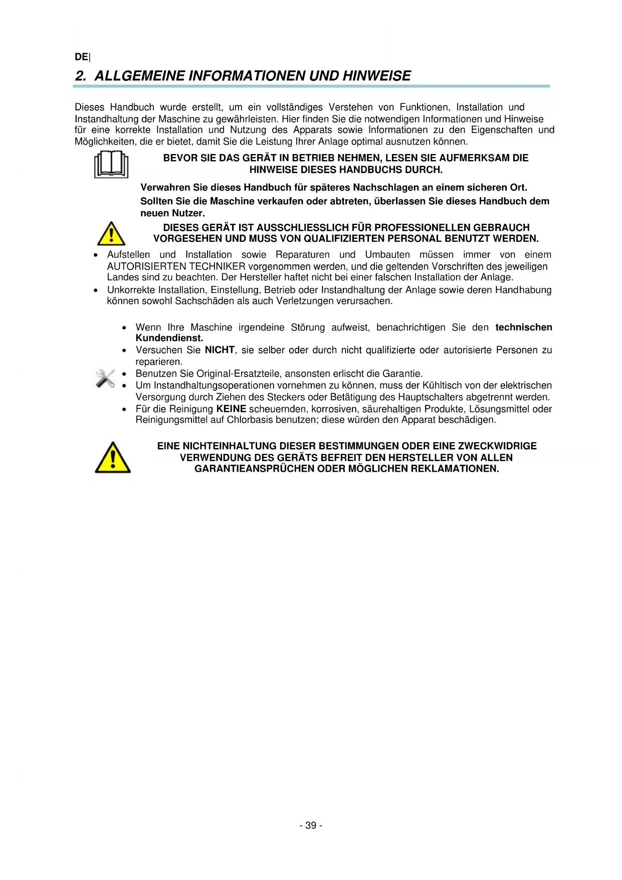 - Aufstellen und Installation sowie Reparaturen und Umbauten müssen immer von einem AUTORISIERENTEN TECHNIKER vorgenommen werden, und die geltenden Vorschriften des jeweiligen Landes sind zu beachten. Der Hersteller haftet nicht bei einer falschen Installation der Anlage.
