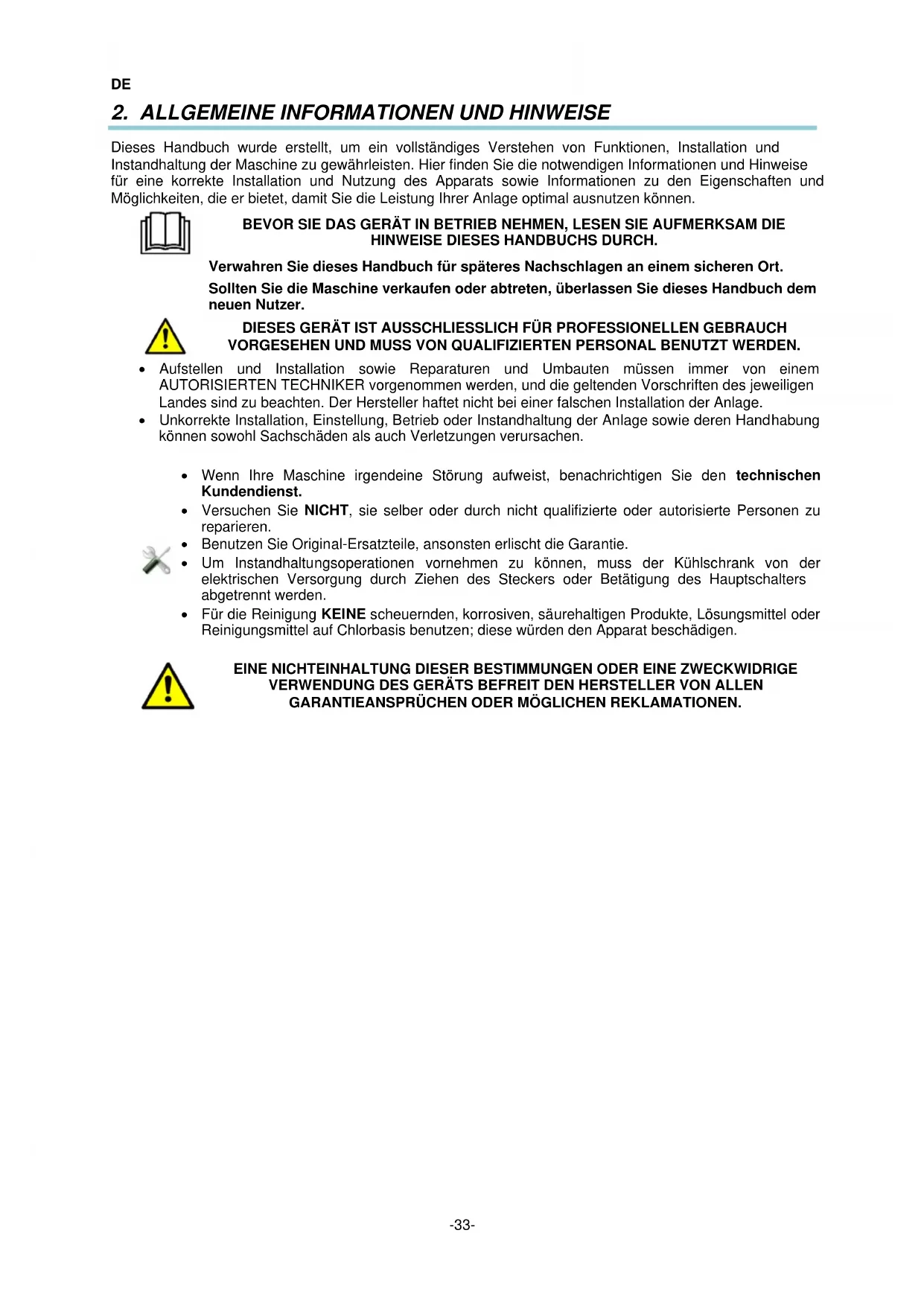 EINE NICHTEINHALTUNG DIESER BESTIMMUNGEN ODER EINE ZWECKWIDRIGE VERWENDUNG DES GERÄTS BEFREIT DEN HERSTELLER VON ALLEN GARANTIEANSPRÜCHEN ODER MÖGLICHEN REKLAMATIONEN.DE