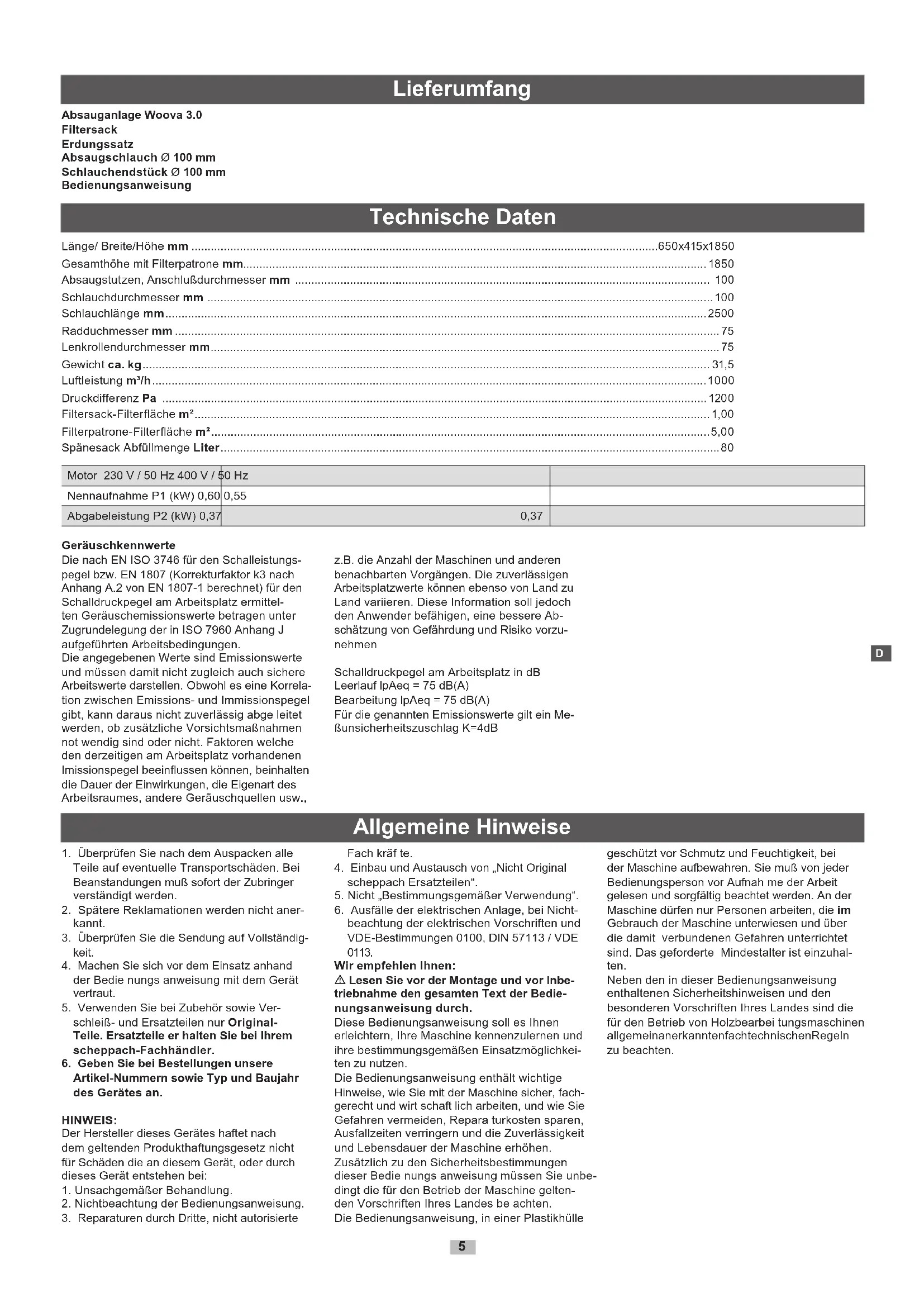 - B230 V / 50 Hz 400 V / 50 HzLieferumfang Absauganlage Woova 3.0 Filtersack Erdungssatz Absaugschlauch Ø 100 mm Schlauchendstück Ø 100 mm Bedienungsanweisung Technische Daten Länge/ Breite/Höhe mm p. 650