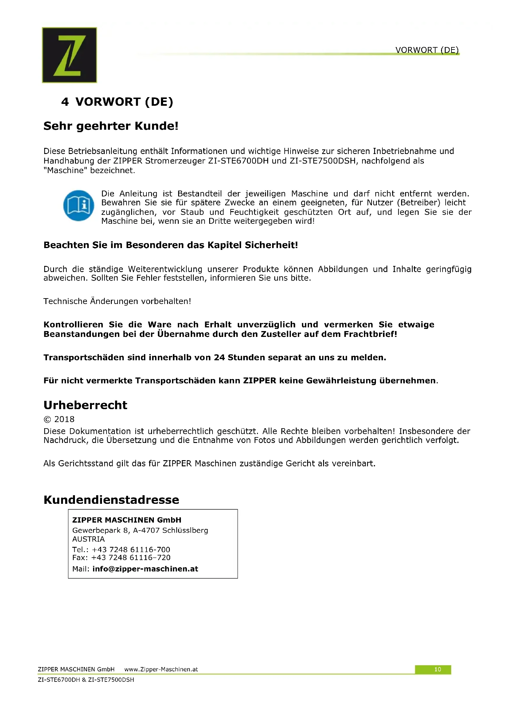 4 VORWORT (DE) Sehr geehrter Kunde! Diese Betriebsanleitung enthält Informationen und wichtige Hinweise zur sicheren Inbetriebnahme und Handhabung der ZIPPER Stromerzeuger ZI-STE6700DH und ZI-STE7500DSH, nachfolgend als "Maschine" bezeichnet. Die Anleitung ist Bestandteil der jeweiligen Maschine und darf nicht entfernt werden. Bewahren Sie sie für spätere Zwecke an einem geeigneten, für Nutzer (Betreiber) leicht zugänglichen, vor Staub und Feuchtigkeit geschützten Ort auf, und legen Sie sie der Maschine bei, wenn sie an Dritte weitergegeben wird! Beachten Sie im Besonderen das Kapitel Sicherheit! Durch die ständige Weiterentwicklung unserer Produkte können Abbildungen und Inhalte geringfügig abweichen. Sollten Sie Fehler feststellen, informieren Sie uns bitte. Technische Änderungen vorbehalten! Kontrollieren Sie die Ware nach Erhalt unverzüglich und vermerken Sie etwaige Beanstandungen bei der Übernahme durch den Zusteller auf dem Frachtbrief! Transportschäden sind innerhalb von 24 Stunden separat an uns zu melden. Für nicht vermerkte Transportschäden kann ZIPPER keine Gewährleistung übernehmen. Urheberrecht © 2018 Diese Dokumentation ist urheberrechtlich geschützt. Alle Rechte bleiben vorbehalten! Insbesondere der Nachdruck, die Übersetzung und die Entnahme von Fotos und Abbildungen werden gerichtlich verfolgt. Als Gerichtsstand gilt das für ZIPPER Maschinen zuständige Gericht als vereinbart.