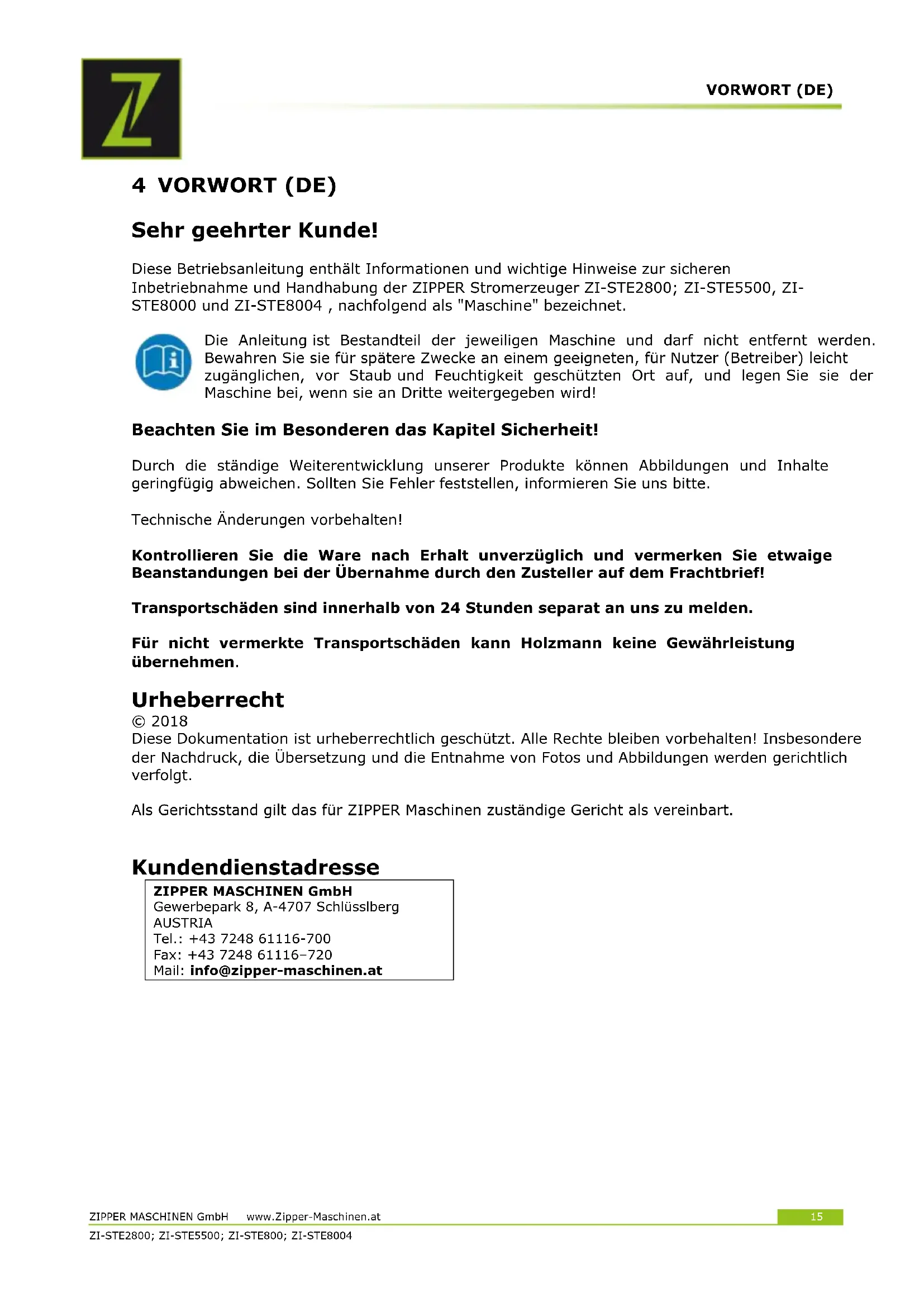 4 VORWORT (DE) Sehr geehrter Kunde! Diese Betriebsanleitung enthält Informationen und wichtige Hinweise zur sicheren Inbetriebnahme und Handhabung der ZIPPER Stromerzeuger ZI-STE2800; ZI-STE5500, ZI- STE8000 und ZI-STE8004 , nachfolgend als "Maschine" bezeichnet. Die Anleitung ist Bestandteil der jeweiligen Maschine und darf nicht entfernt werden. Bewahren Sie sie für spätere Zwecke an einem geeigneten, für Nutzer (Betreiber) leicht zugänglichen, vor Staub und Feuchtigkeit geschützten Ort auf, und legen Sie sie der Maschine bei, wenn sie an Dritte weitergegeben wird! Beachten Sie im Besonderen das Kapitel Sicherheit! Durch die ständige Weiterentwicklung unserer Produkte können Abbildungen und Inhalte geringfügig abweichen. Sollten Sie Fehler feststellen, informieren Sie uns bitte. Technische Änderungen vorbehalten! Kontrollieren Sie die Ware nach Erhalt unverzüglich und vermerken Sie etwaige Beanstandungen bei der Übernahme durch den Zusteller auf dem Frachtbrief! Transportschäden sind innerhalb von 24 Stunden separat an uns zu melden. Für nicht vermerkte Transportschäden kann Holzmann keine Gewährleistung übernehmen. Urheberrecht © 2018 Diese Dokumentation ist urheberrechtlich geschützt. Alle Rechte bleiben vorbehalten! Insbesondere der Nachdruck, die Übersetzung und die Entnahme von Fotos und Abbildungen werden gerichtlich verfolgt. Als Gerichtsstand gilt das für ZIPPER Maschinen zuständige Gericht als vereinbart.