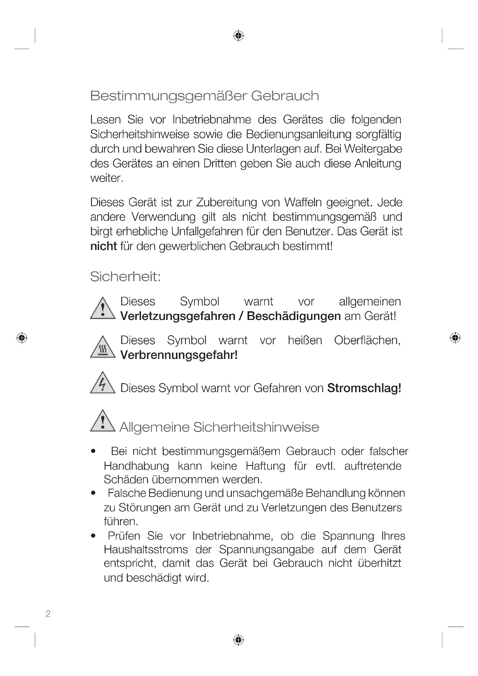 Bestimmungsgemäßer Gebrauch Lesen Sie vor Inbetriebnahme des Gerätes die folgenden Sicherheitshinweise sowie die Bedienungsanleitung sorgfältig durch und bewahren Sie diese Unterlagen auf. Bei Weitergabe des Gerätes an einen Dritten geben Sie auch diese Anleitung weiter. Dieses Gerät ist zur Zubereitung von Waffeln geeignet. Jede andere Verwendung gilt als nicht bestimmungsgemäß und birgt erhebliche Unfallgefahren für den Benutzer. Das Gerät ist nicht für den gewerblichen Gebrauch bestimmt! Sicherheit: Dieses Symbol warnt vor allgemeinen Verletzungsgefahren / Beschädigungen am Gerät! Dieses Symbol warnt vor heißen Oberflächen, Verbrennungsgefahr! Dieses Symbol warnt vor Gefahren von Stromschlag! Allgemeine Sicherheitshinweise