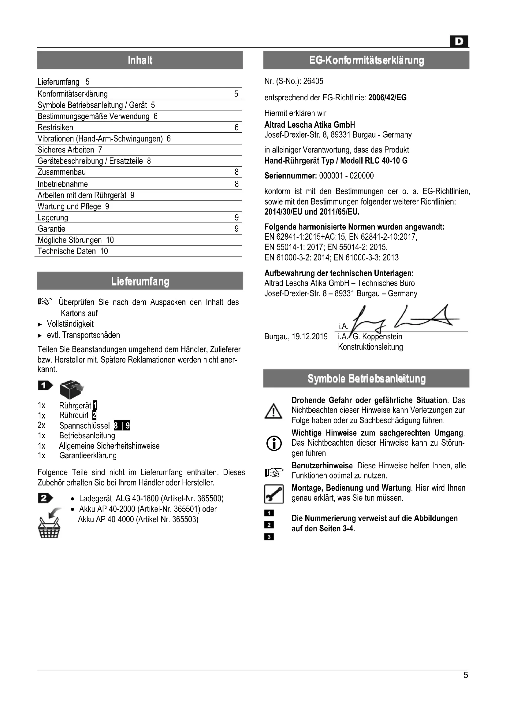 Nr. (S-No.): 26405 entsprechend der EG-Richtlinie: 2006/42/EG Hiermit erklären wir Altrad Lescha Atika GmbH Josef-Drexler-Str. 8, 89331 Burgau - Germany in alleiniger Verantwortung, dass das Produkt Hand-Rührgerät Typ / Modell RLC 40-10 G Seriennummer: 000001 - 020000 konform ist mit den Bestimmungen der o. a. EG-Richtlinien, sowie mit den Bestimmungen folgender weiterer Richtlinien: 2014/30/EU und 2011/65/EU. Folgende harmonisierte Normen wurden angewandt: EN 62841-1:2015+AC:15, EN 62841-2-10:2017, EN 55014-1: 2017; EN 55014-2: 2015, EN 61000-3-2: 2014; EN 61000-3-3: 2013 Aufbewahrung der technischen Unterlagen: Altrad Lescha Atika GmbH – Technisches Büro Josef-Drexler-Str. 8 – 89331 Burgau – Germany