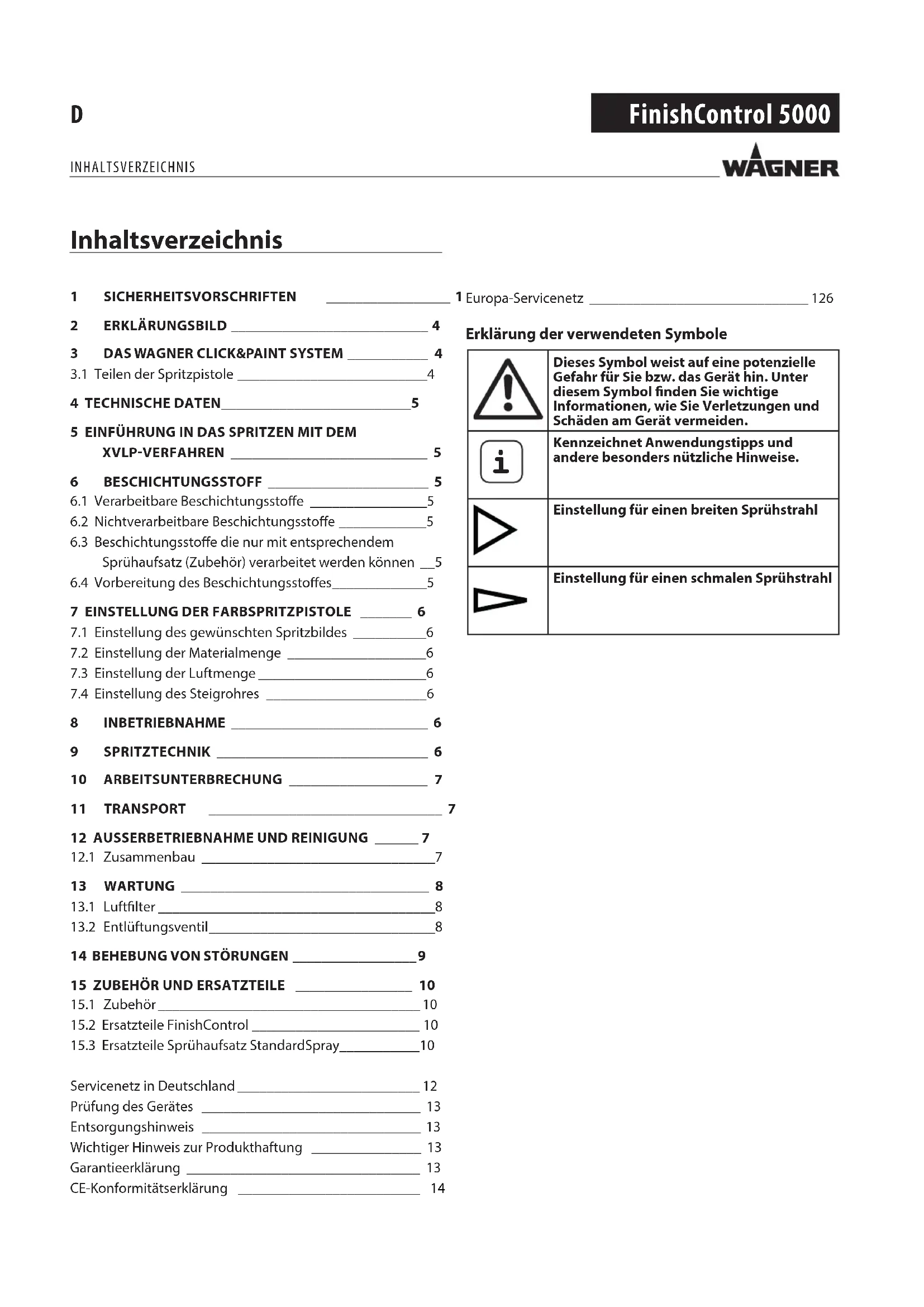 3. AbwicklungZeigen sich innerhalb der Garantiezeit Fehler in Material, Ver-arbeitung oder Leistung des Geräts, so sind Garantieansprü-che unverzüglich, spätestens jedoch in einer Frist von 2 Wo-chen geltend zu machen. Zur Entgegennahme von Garantieansprüchen ist der autori-sierte Fachhändler, welcher das Gerät ausgeliefert hat, berech-tigt. Die Garantieansprüche können aber auch bei unserer der in der Bedienungsanleitung genannten Servicedienststellen geltend gemacht werden. Das Produkt muss zusammen mit dem Original-Kaufbeleg, der die Angabe des Kaufdatums und der Produktbezeichnung enthalten muss, frei eingesandt oder vorgelegt werden. Zur Inanspruchnahme der Garantie-verlängerung muss zusätzlich das Garantiezertikat beigefügt werden. Die Kosten sowie das Risiko eines Verlustes oder einer Beschä-digung des Produkts auf dem Weg zu oder von der Stelle, wel-che die Garantieansprüche entgegennimmt oder das instand gesetzte Produkt wieder ausliefert, trägt der Kunde.4. Ausschluss der GarantieGarantieansprüche können nicht berücksichtigt werden für Teile, die einem gebrauchsbedingten oder sonstigen, natürlichen Verschleiß unterliegen, sowie Mängel am Produkt, die auf einen gebrauchsbedingten oder sonstigen natürlichen Verschleiß zurückzuführen sind. Hierzu zählen insbesondere Kabel, Ventile, Packungen, Düsen, Zylinder, Kolben, Medium führende Gehäuseteile, Filter, Schläuche, Dichtungen, Rotoren, Statoren, etc.. Schäden durch Verschleiß werden insbesondere verursacht durch schmirgeln-de Beschichtungsstoe, wie beispielsweise Dispersionen, Putze, Spachtel, Kleber, Glasuren, Quarzgrund. bei Fehlern an Geräten, die auf Nichtbeachtung von Bedienungshinweisen, ungeeignete oder unsachgemäße Verwendung, fehlerhafte Montage, bzw. Inbetriebsetzung durch den Käufer oder durch Dritte, nicht bestimmungs-gemäßen Gebrauch, anomale Umweltbedingungen, ungeeignete Beschichtungsstoffe, chemische, elektrochemische oder elektrische Einüsse, sachfremde Betriebsbedingungen, Betrieb mit falscher Netzspannung/ -Frequenz, Überlastung oder mangelnde Wartung oder Pege bzw. Reinigung zurückzuführen sind. bei Fehlern am Gerät, die durch Verwendung von Zubehör-, Ergänzungs- oder Ersatzteilen verursacht wurden, die keine Wagner-Originalteile sind. bei Produkten, an denen Veränderungen oder Ergänzungen vorgenommen wurden. bei Produkten mit entfernter oder unlesbar gemachter Seriennummer bei Produkten, an denen von nicht autorisierten Personen Reparaturversuche durchgeführt wurden. bei Produkten mit geringfügigen Abweichungen von der Soll-Beschaenheit, die für Wert und Gebrauchstauglichkeit des Geräts unerheblich sind. bei Produkten, die teilweise oder komplett zerlegt worden sind.5. Ergänzende RegelungenObige Garantien gelten ausschließlich für Produkte, die in der EU, GUS, Australien vom autorisierten Fachhandel gekauft und innerhalb des Bezugslandes verwendet werden.Ergibt die Prüfung, dass kein Garantiefall vorliegt, so geht die Reparatur zu Lasten des Käufers.Die vorstehenden Bestimmungen regeln das Rechtsverhältnis zu uns abschließend. Weitergehende Ansprüche, insbeson-dere für Schäden und Verluste gleich welcher Art, die durch das Produkt oder dessen Gebrauch entstehen, sind außer im Anwendungsbereich des Produkthaftungsgesetzes ausge-schlossen. Mängelhaftungsansprüche gegen den Fachhändler bleiben unberührt.Für diese Garantie gilt deutsches Recht Die Vertragssprache ist deutsch. Im Fall, dass die Bedeutung des deutschen und eines ausländischen Textes dieser Garantie voneinander abweichen, ist die Bedeutung des deutschen Textes vorrangig.J. Wagner GmbHDivision Professional FinishingOtto Lilienthal Strasse 18 88677 MarkdorfBundesrepublik DeutschlandÄnderungen vorbehalten EU Konformitätserklärung Wir erklären in alleiniger Verantwortung, dass dieses Produkt den folgenden einschlägigen Bestimmungen entspricht: 2006/42/EG, 2014/30/EU, 2011/65/EU, 2012/19/EU Angewandte harmonisierte Normen: EN 60745-1, EN 50580, EN 62233, EN 55014-1, EN 55014-2, EN 61000-3-2, EN 61000-3-3, EN 61000-4-2, EN 61000-4-4, EN 61000-4-5, EN 61000-4-6, EN 61000-4-11 Die EU Konformitätserklärung liegt dem Produkt bei. Sie kann bei Bedarf mit der Bestellnummer 2368397 nachbestellt werden. GARANTIEERKLÄRUNG15 FinishControl 5000