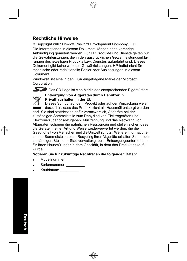 © Copyright 2007 Hewlett-Packard Development Company, L.P. Die Informationen in diesem Dokument können ohne vorherige Ankündigung geändert werden. Für HP Produkte und Dienste gelten nur die Gewährleistungen, die in den ausdrücklichen Gewährleistungserklärungen des jeweiligen Produkts bzw. Dienstes aufgeführt sind. Dieses Dokument gibt keine weiteren Gewährleistungen. HP haftet nicht für technische oder redaktionelle Fehler oder Auslassungen in diesem Dokument. Windows® ist eine in den USA eingetragene Marke der Microsoft Corporation. Das SD-Logo ist eine Marke des entsprechenden Eigentümers. Entsorgung von Altgeräten durch Benutzer in Privathaushalten in der EU Dieses Symbol auf dem Produkt oder auf der Verpackung weist darauf hin, dass das Produkt nicht als Hausmüll entsorgt werden darf. Sie sind stattdessen dafür verantwortlich, Altgeräte bei der zuständigen Sammelstelle zum Recycling von Elektrogeräten und Elektronikzubehör abzugeben. Mülltrennung und das Recycling von Altgeräten schonen die natürlichen Ressourcen und stellen sicher, dass die Geräte in einer Art und Weise wiederverwertet werden, die die Gesundheit von Menschen und die Umwelt schützt. Weitere Informationen zu den Sammelstellen zum Recycling Ihrer Altgeräte erhalten Sie bei der zuständigen Stelle der Stadtverwaltung, beim Entsorgungsunternehmen für Ihren Hausmüll oder in dem Geschäft, in dem das Produkt gekauft wurde. Notieren Sie für zukünftige Nachfragen die folgenden Daten: • Modellnummer: _________ • Seriennummer: _________ • Kaufdatum: _________