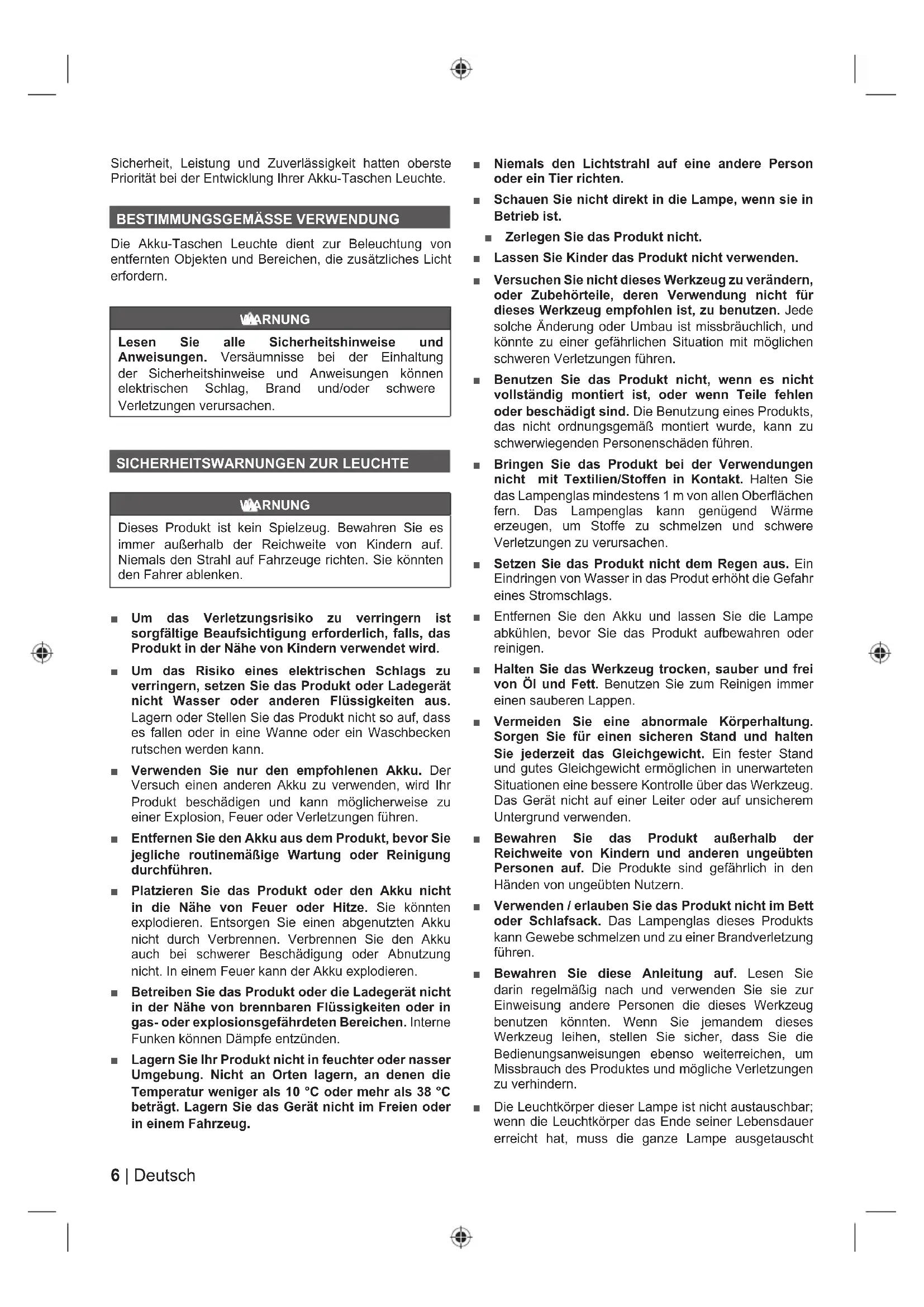WARNUNG Dieses Produkt ist kein Spielzeug. Bewahren Sie es immer außerhalb der Reichweite von Kindern auf. Niemals den Strahl auf Fahrzeuge richten. Sie könnten den Fahrer ablenken. Ŷ Um das Verletzungsrisiko zu verringern ist sorgfältige Beaufsichtigung erforderlich, falls, das Produkt in der Nähe von Kindern verwendet wird. Ŷ Um das Risiko eines elektrischen Schlags zu verringern, setzen Sie das Produkt oder Ladegerät nicht Wasser oder anderen Flüssigkeiten aus. Lagern oder Stellen Sie das Produkt nicht so auf, dass es fallen oder in eine Wanne oder ein Waschbecken rutschen werden kann. Ŷ Verwenden Sie nur den empfohlenen Akku. Der Versuch einen anderen Akku zu verwenden, wird Ihr Produkt beschädigen und kann möglicherweise zu einer Explosion, Feuer oder Verletzungen führen. Ŷ Entfernen Sie den Akku aus dem Produkt, bevor Sie jegliche routinemäßige Wartung oder Reinigung durchführen. Ŷ Platzieren Sie das Produkt oder den Akku nicht in die Nähe von Feuer oder Hitze. Sie könnten explodieren. Entsorgen Sie einen abgenutzten Akku nicht durch Verbrennen. Verbrennen Sie den Akku auch bei schwerer Beschädigung oder Abnutzung nicht. In einem Feuer kann der Akku explodieren. Ŷ Betreiben Sie das Produkt oder die Ladegerät nicht in der Nähe von brennbaren Flüssigkeiten oder in gas- oder explosionsgefährdeten Bereichen. Interne Funken können Dämpfe entzünden. Ŷ Lagern Sie Ihr Produkt nicht in feuchter oder nasser Umgebung. Nicht an Orten lagern, an denen die Temperatur weniger als 10 °C oder mehr als 38 °C beträgt. Lagern Sie das Gerät nicht im Freien oder in einem Fahrzeug. Ŷ Niemals den Lichtstrahl auf eine andere Person oder ein Tier richten. Ŷ Schauen Sie nicht direkt in die Lampe, wenn sie in Betrieb ist. Ŷ Zerlegen Sie das Produkt nicht. Ŷ Lassen Sie Kinder das Produkt nicht verwenden. Ŷ Versuchen Sie nicht dieses Werkzeug zu verändern, oder Zubehörteile, deren Verwendung nicht für dieses Werkzeug empfohlen ist, zu benutzen. Jede solche Änderung oder Umbau ist missbräuchlich, und könnte zu einer gefährlichen Situation mit möglichen schweren Verletzungen führen. Ŷ Benutzen Sie das Produkt nicht, wenn es nicht vollständig montiert ist, oder wenn Teile fehlen oder beschädigt sind. Die Benutzung eines Produkts, das nicht ordnungsgemäß montiert wurde, kann zu schwerwiegenden Personenschäden führen. Ŷ Bringen Sie das Produkt bei der Verwendungen nicht mit Textilien/Stoffen in Kontakt. Halten Sie das Lampenglas mindestens 1 m von allen Oberflächen fern. Das Lampenglas kann genügend Wärme erzeugen, um Stoffe zu schmelzen und schwere Verletzungen zu verursachen. Ŷ Setzen Sie das Produkt nicht dem Regen aus. Ein Eindringen von Wasser in das Produt erhöht die Gefahr eines Stromschlags. Ŷ Entfernen Sie den Akku und lassen Sie die Lampe abkühlen, bevor Sie das Produkt aufbewahren oder reinigen. Ŷ Halten Sie das Werkzeug trocken, sauber und frei von Öl und Fett. Benutzen Sie zum Reinigen immer einen sauberen Lappen. Ŷ Vermeiden Sie eine abnormale Körperhaltung. Sorgen Sie für einen sicheren Stand und halten Sie jederzeit das Gleichgewicht. Ein fester Stand und gutes Gleichgewicht ermöglichen in unerwarteten Situationen eine bessere Kontrolle über das Werkzeug. Das Gerät nicht auf einer Leiter oder auf unsicherem Untergrund verwenden. Ŷ Bewahren Sie das Produkt außerhalb der Reichweite von Kindern und anderen ungeübten Personen auf. Die Produkte sind gefährlich in den Händen von ungeübten Nutzern. Ŷ Verwenden / erlauben Sie das Produkt nicht im Bett oder Schlafsack. Das Lampenglas dieses Produkts kann Gewebe schmelzen und zu einer Brandverletzung führen. Ŷ Bewahren Sie diese Anleitung auf. Lesen Sie darin regelmäßig nach und verwenden Sie sie zur Einweisung andere Personen die dieses Werkzeug benutzen könnten. Wenn Sie jemandem dieses Werkzeug leihen, stellen Sie sicher, dass Sie die Bedienungsanweisungen ebenso weiterreichen, um Missbrauch des Produktes und mögliche Verletzungen zu verhindern. Ŷ Die Leuchtkörper dieser Lampe ist nicht austauschbar; wenn die Leuchtkörper das Ende seiner Lebensdauer erreicht hat, muss die ganze Lampe ausgetauscht7 Deutsch |
