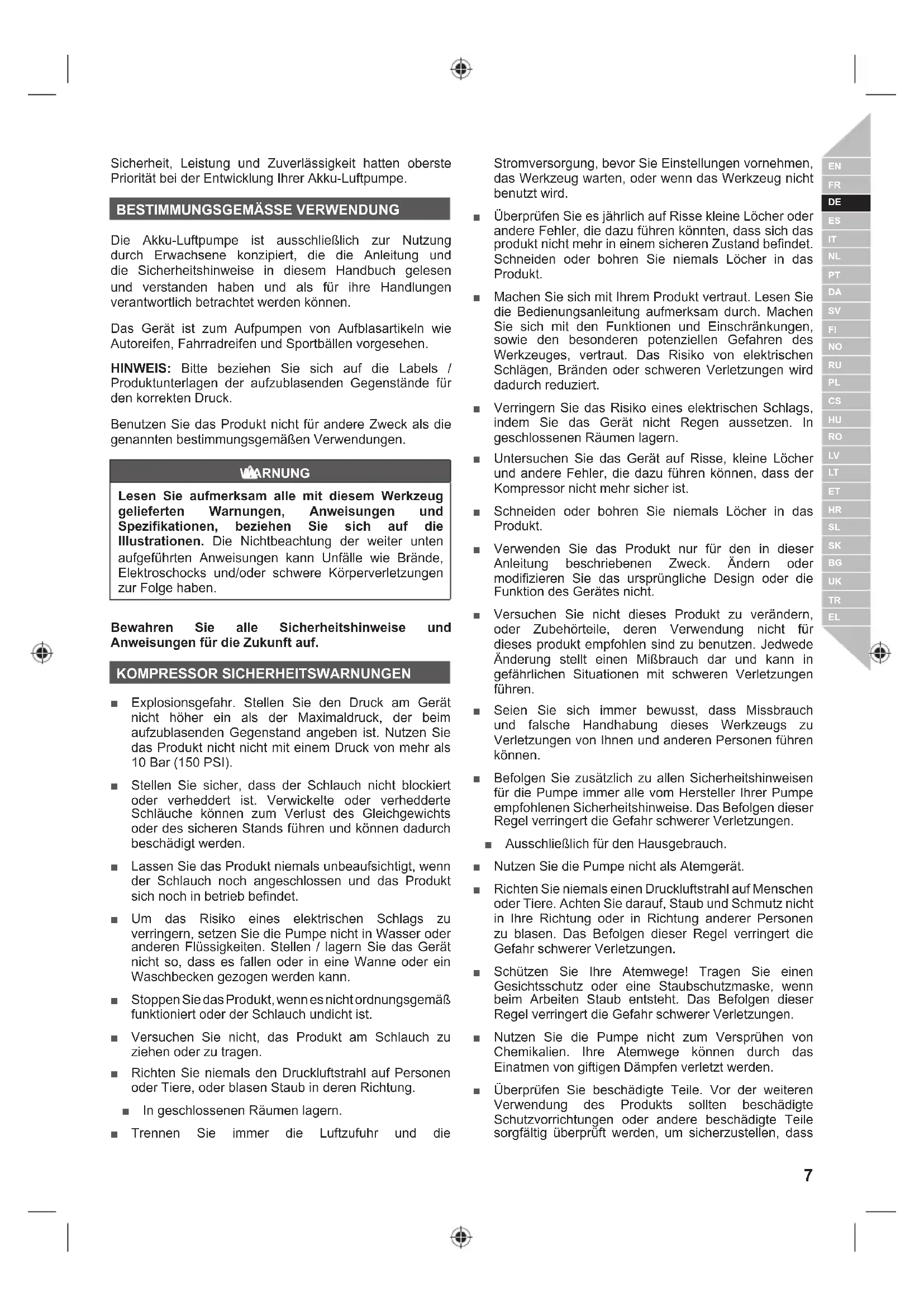 Die Akku-Luftpumpe ist ausschließlich zur Nutzung durch Erwachsene konzipiert, die die Anleitung und die Sicherheitshinweise in diesem Handbuch gelesen und verstanden haben und als für ihre Handlungen verantwortlich betrachtet werden können. Das Gerät ist zum Aufpumpen von Aufblasartikeln wie Autoreifen, Fahrradreifen und Sportbällen vorgesehen. HINWEIS: Bitte beziehen Sie sich auf die Labels / Produktunterlagen der aufzublasenden Gegenstände für den korrekten Druck. Benutzen Sie das Produkt nicht für andere Zweck als die genannten bestimmungsgemäßen Verwendungen. WARNUNG Lesen Sie aufmerksam alle mit diesem Werkzeug gelieferten Warnungen, Anweisungen und Spezifikationen, beziehen Sie sich auf die Illustrationen. Die Nichtbeachtung der weiter unten aufgeführten Anweisungen kann Unfälle wie Brände, Elektroschocks und/oder schwere Körperverletzungen zur Folge haben. Bewahren Sie alle Sicherheitshinweise und Anweisungen für die Zukunft auf. KOMPRESSOR SICHERHEITSWARNUNGEN ■ Explosionsgefahr. Stellen Sie den Druck am Gerät nicht höher ein als der Maximaldruck, der beim aufzublasenden Gegenstand angeben ist. Nutzen Sie das Produkt nicht nicht mit einem Druck von mehr als 10 Bar (150 PSI). ■ Stellen Sie sicher, dass der Schlauch nicht blockiert oder verheddert ist. Verwickelte oder verhedderte Schläuche können zum Verlust des Gleichgewichts oder des sicheren Stands führen und können dadurch beschädigt werden. ■ Lassen Sie das Produkt niemals unbeaufsichtigt, wenn der Schlauch noch angeschlossen und das Produkt sich noch in betrieb befindet. ■ Um das Risiko eines elektrischen Schlags zu verringern, setzen Sie die Pumpe nicht in Wasser oder anderen Flüssigkeiten. Stellen / lagern Sie das Gerät nicht so, dass es fallen oder in eine Wanne oder ein Waschbecken gezogen werden kann. ■ Stoppen Sie das Produkt, wenn es nicht ordnungsgemäß funktioniert oder der Schlauch undicht ist. ■ Versuchen Sie nicht, das Produkt am Schlauch zu ziehen oder zu tragen. ■ Richten Sie niemals den Druckluftstrahl auf Personen oder Tiere, oder blasen Staub in deren Richtung. ■ In geschlossenen Räumen lagern. ■ Trennen Sie immer die Luftzufuhr und die Stromversorgung, bevor Sie Einstellungen vornehmen, das Werkzeug warten, oder wenn das Werkzeug nicht benutzt wird. ■ Überprüfen Sie es jährlich auf Risse kleine Löcher oder andere Fehler, die dazu führen könnten, dass sich das produkt nicht mehr in einem sicheren Zustand befindet. Schneiden oder bohren Sie niemals Löcher in das Produkt. ■ Machen Sie sich mit Ihrem Produkt vertraut. Lesen Sie die Bedienungsanleitung aufmerksam durch. Machen Sie sich mit den Funktionen und Einschränkungen, sowie den besonderen potenziellen Gefahren des Werkzeuges, vertraut. Das Risiko von elektrischen Schlägen, Bränden oder schweren Verletzungen wird dadurch reduziert. ■ Verringern Sie das Risiko eines elektrischen Schlags, indem Sie das Gerät nicht Regen aussetzen. In geschlossenen Räumen lagern. ■ Untersuchen Sie das Gerät auf Risse, kleine Löcher und andere Fehler, die dazu führen können, dass der Kompressor nicht mehr sicher ist. ■ Schneiden oder bohren Sie niemals Löcher in das Produkt. ■ Verwenden Sie das Produkt nur für den in dieser Anleitung beschriebenen Zweck. Ändern oder modifizieren Sie das ursprüngliche Design oder die Funktion des Gerätes nicht. ■ Versuchen Sie nicht dieses Produkt zu verändern, oder Zubehörteile, deren Verwendung nicht für dieses produkt empfohlen sind zu benutzen. Jedwede Änderung stellt einen Mißbrauch dar und kann in gefährlichen Situationen mit schweren Verletzungen führen. ■ Seien Sie sich immer bewusst, dass Missbrauch und falsche Handhabung dieses Werkzeugs zu Verletzungen von Ihnen und anderen Personen führen können. ■ Befolgen Sie zusätzlich zu allen Sicherheitshinweisen für die Pumpe immer alle vom Hersteller Ihrer Pumpe empfohlenen Sicherheitshinweise. Das Befolgen dieser Regel verringert die Gefahr schwerer Verletzungen. ■ Ausschließlich für den Hausgebrauch. ■ Nutzen Sie die Pumpe nicht als Atemgerät. ■ Richten Sie niemals einen Druckluftstrahl auf Menschen oder Tiere. Achten Sie darauf, Staub und Schmutz nicht in Ihre Richtung oder in Richtung anderer Personen zu blasen. Das Befolgen dieser Regel verringert die Gefahr schwerer Verletzungen. ■ Schützen Sie Ihre Atemwege! Tragen Sie einen Gesichtsschutz oder eine Staubschutzmaske, wenn beim Arbeiten Staub entsteht. Das Befolgen dieser Regel verringert die Gefahr schwerer Verletzungen. ■ Nutzen Sie die Pumpe nicht zum Versprühen von Chemikalien. Ihre Atemwege können durch das Einatmen von giftigen Dämpfen verletzt werden. ■ Überprüfen Sie beschädigte Teile. Vor der weiteren Verwendung des Produkts sollten beschädigte Schutzvorrichtungen oder andere beschädigte Teile sorgfältig überprüft werden, um sicherzustellen, dass8 | Deutsch sie korrekt arbeiten und die vorgesehene Funktion ausführen. Überprüfen Sie die Ausrichtung beweglicher Teile, ob bewegliche Teile klemmen, Beschädigungen von Teilen, und andere Umstände, die sich auf den Betrieb auswirken könnten. Eine beschädigte Schutzvorrichtung oder alle anderen beschädigten Teile müssen durch einen autorisierten Kundendienst repariert werden. Das Risiko von elektrischen Schlägen, Bränden oder schweren Verletzungen wird dadurch reduziert. ■ Überprüfen Sie das Werkzeug regelmäßig und lassen es von einem autorisierten Kundendienst reparieren. Achten Sie darauf, dass Ihnen stets bewusst ist, wo das Kabel verläuft. Durch Befolgung dieser Anweisung verringern Sie die Risiken eines elektrischen Schlags oder Feuers. ■ Explosionsgefahr. Beobachten Sie die Gegenstände während des Aufpumpens sorgsam. ■ Um das Risiko zu verringern, den gegenstand zu sehr aufzupumpen, nutzen Sie bitte regelmäßig einen zuverlässigen Druckmesser. Der Druckmesser am Kompressor dient nur zu Referenzzwecken und ist nicht geeicht und liefert